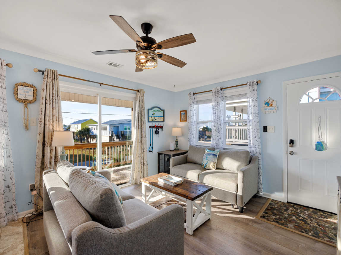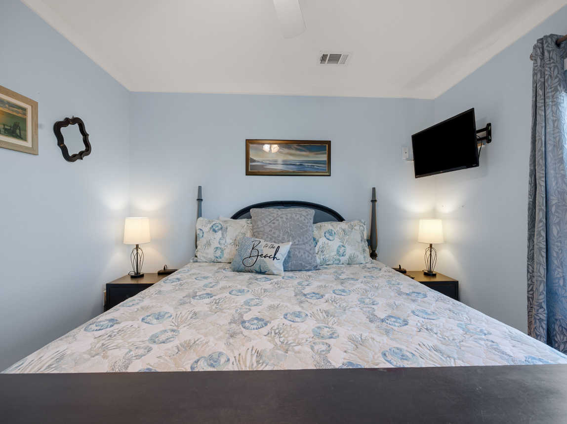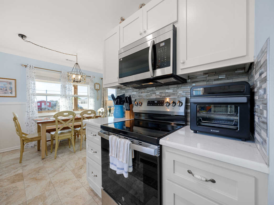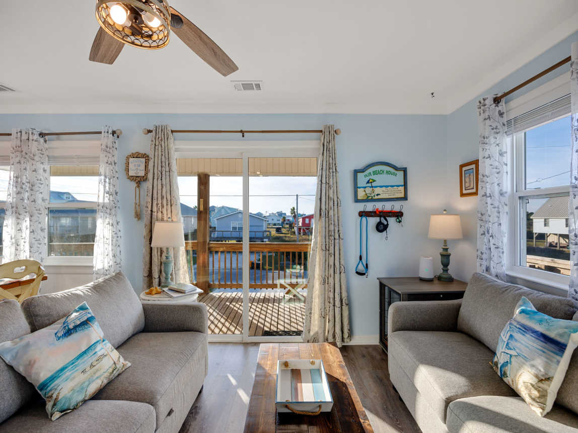 This beach home in the Fort Morgan area of Gulf Shores offers a tranquil retreat with breathtaking views. The updated three-bedroom, two-bathroom house features a private deck off the master bedroom, providing a serene spot to take in the fantastic vistas of the Gulf of Mexico and Mobile Bay.