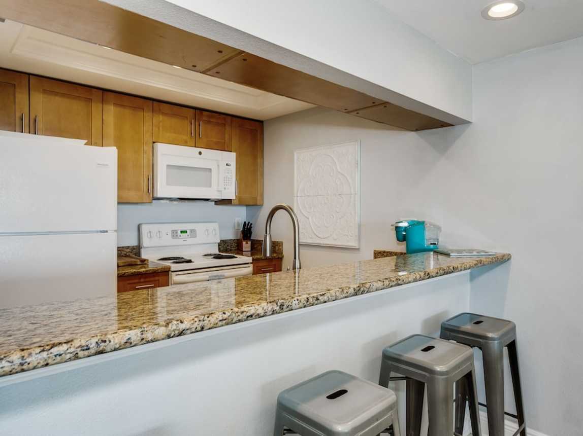 Enjoy unbeatable waterside serenity with easy boardwalk access to the beach. The condo also offers private parking, the island’s largest Olympic size pool, tennis courts, and even pier docking (daytime use only) for extra recreational flair.