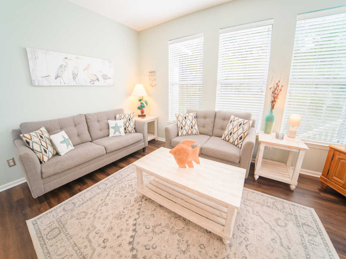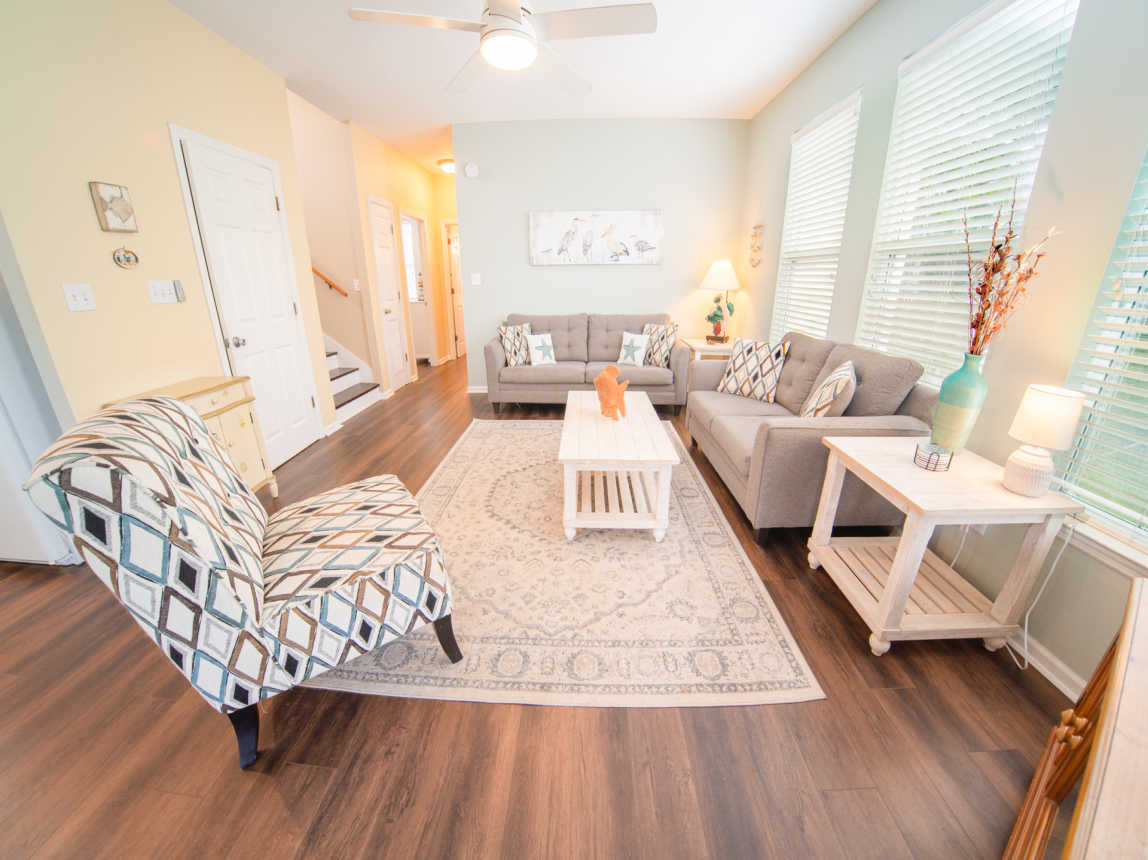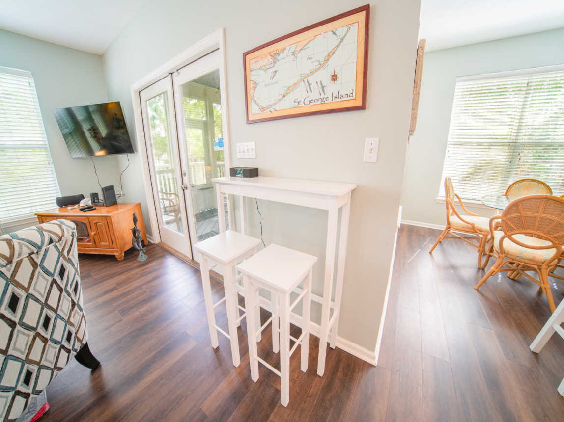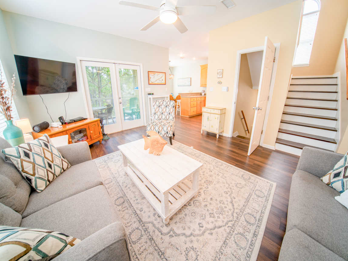 A quick 3-4 minute walk to the beach, this home is surrounded by natural vegetation and located in a quiet neighborhood within the prestigious St. George Plantation gated community. The 1st floor living room offers a large, flat screen TV and DVD player, and a Queen sleeper sofa for additional sleeping for up to 2 guests. This relaxed space opens onto a shade...