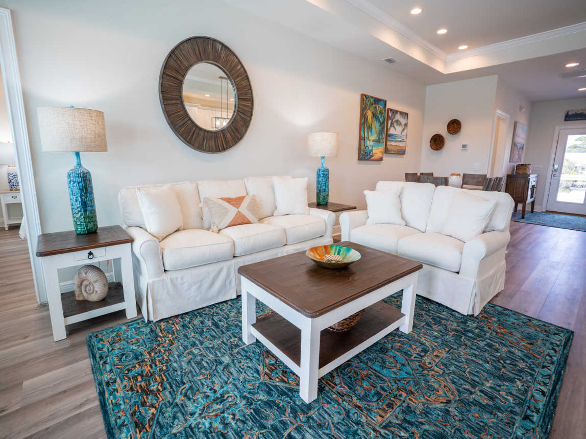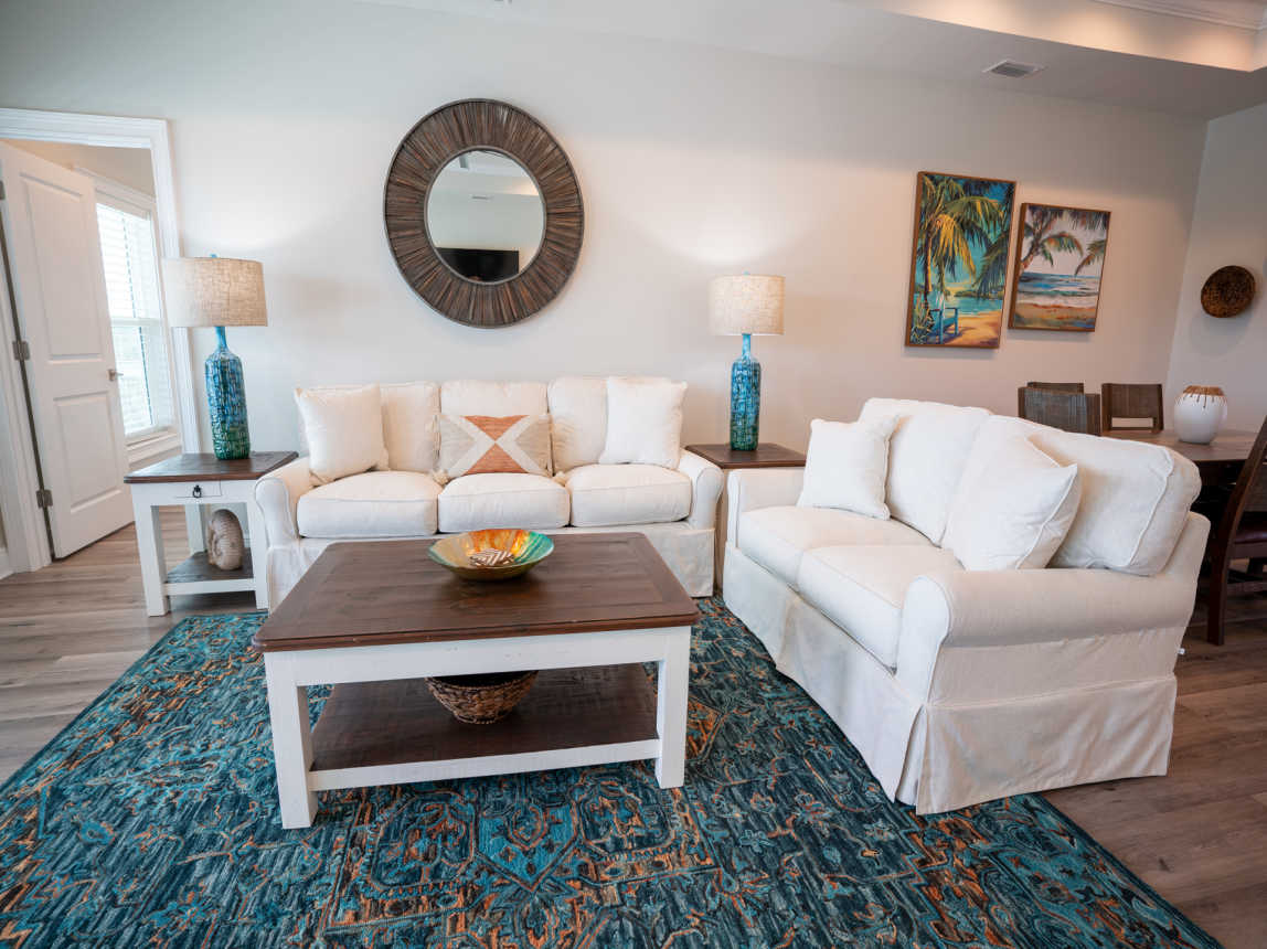The open living area is comfortably furnished with down-filled loveseat and sofa with Queen sleeper option, a large flatscreen TV with streaming channels, tray ceilings and Gulf views. The living room opens to a l...
