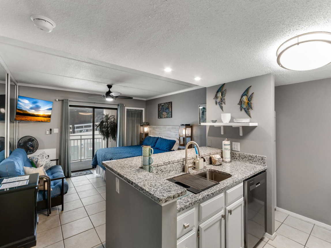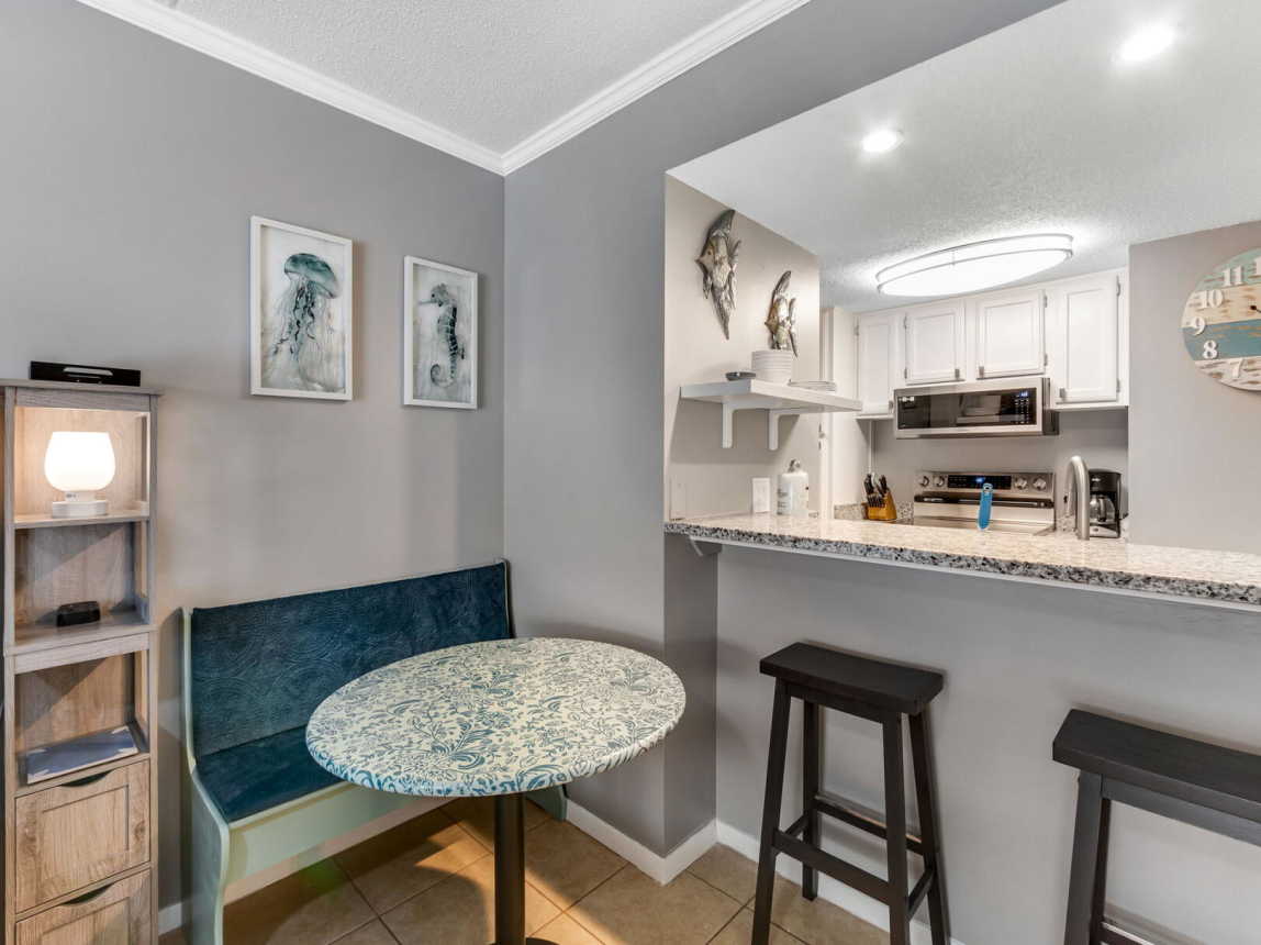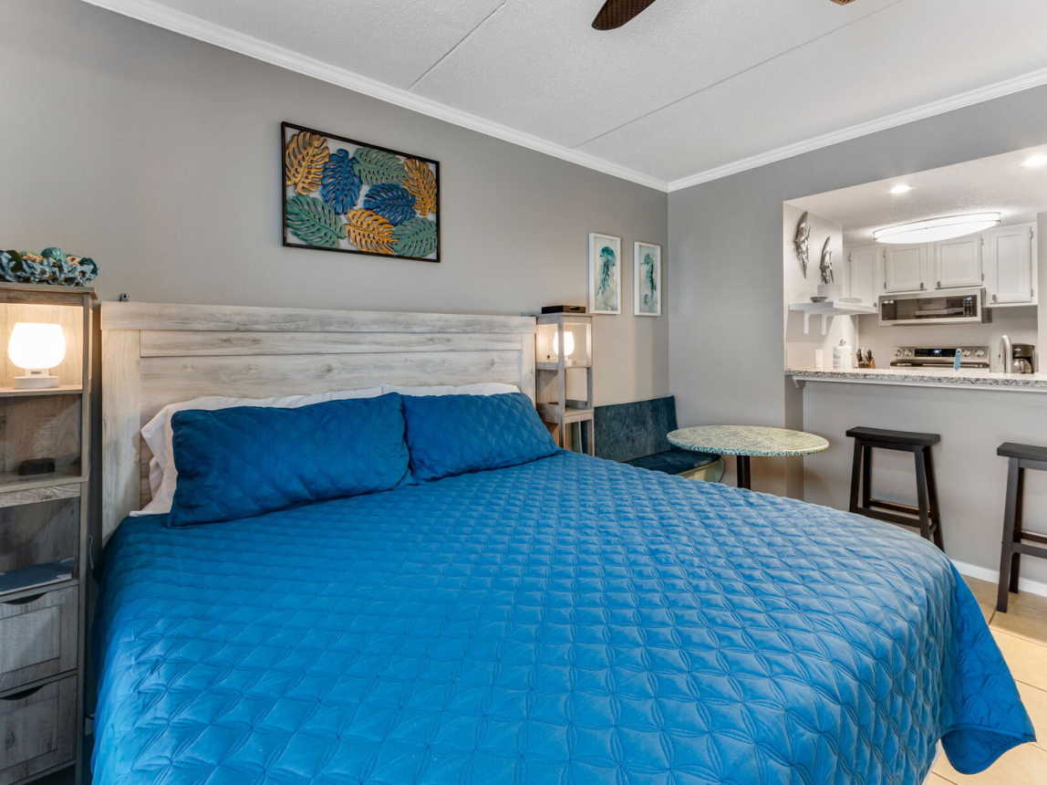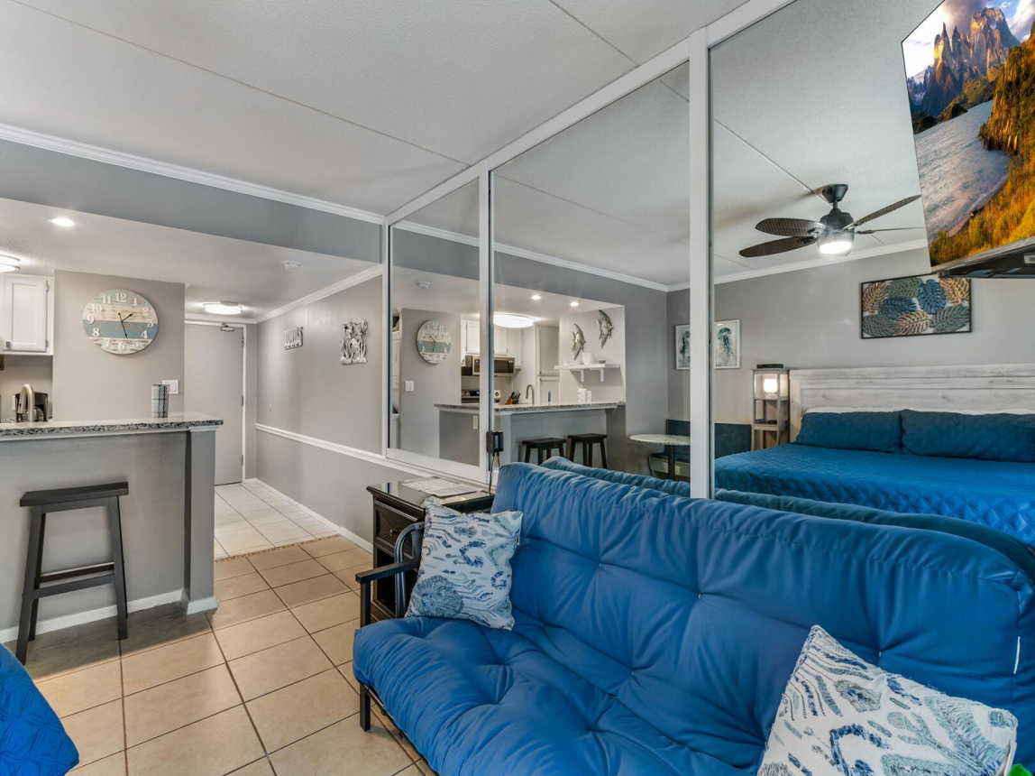 The condo has been updated with granite countertops and tile floors. Inside, you'll find a spacious living area with a King-sized bed, perfect for a peaceful night's sleep after a day of beach adventures. Relax on the Queen-sized sofa sleeper or watch your favorite TV show on the flat-screen TV.