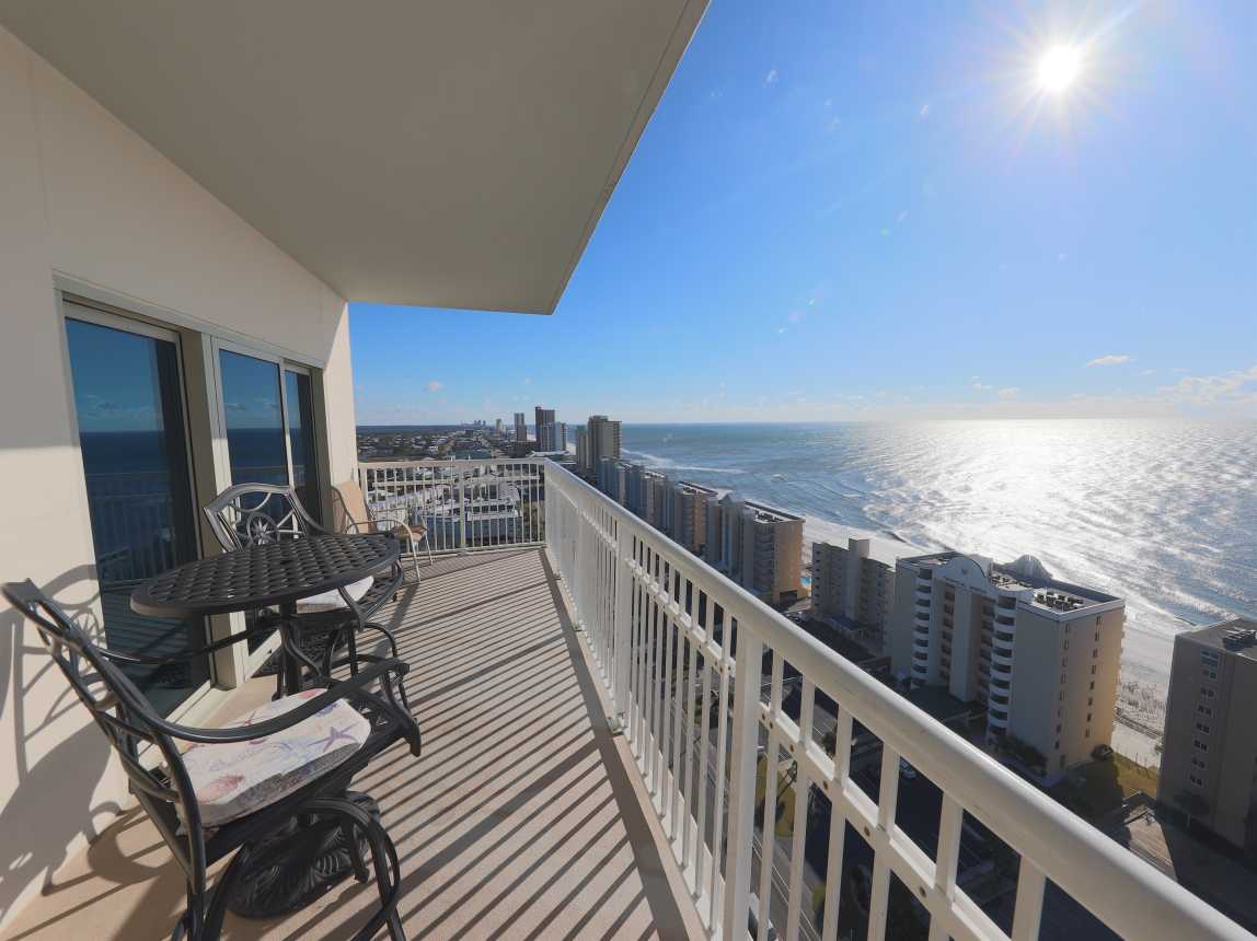 Situated on the 19th floor, this unit features expansive windows along the east wall in the living room, filling the space with natural light and offering picturesque views of the surrounding area. The windows are tinted to ensure an optimal view while maintaining comfort. Step out onto one of two balconies—a large south-facing balcony with panoramic views spanning from the Gulf of Mexico to the end of Gulf Shores and into Orange Beach, o...
