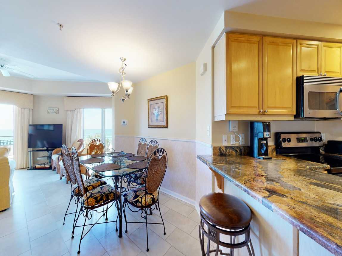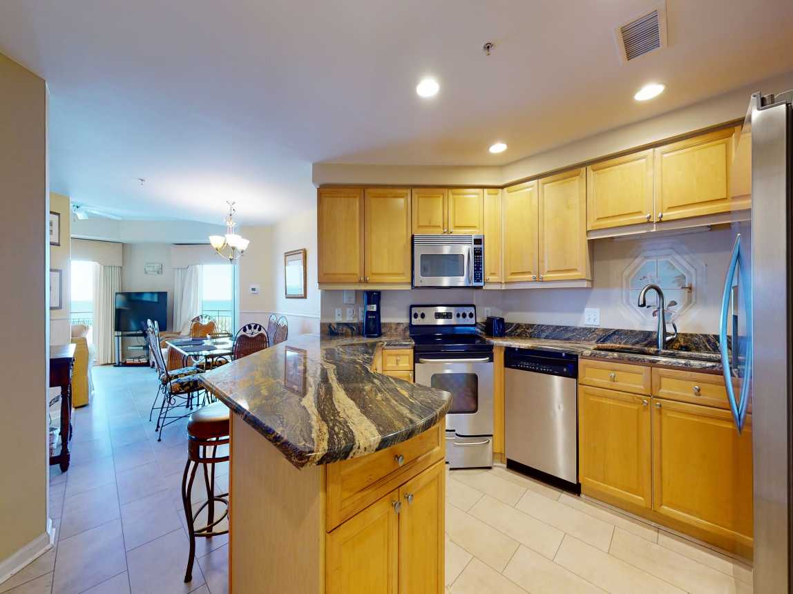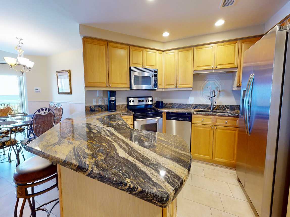 Step into coastal luxury the moment you walk through the door of this stunning Gulf-front retreat. The open-concept design welcomes you with a spacious, modern kitchen featuring sleek granite countertops, premium appliances, and all the essentials for creating memorable meals. Recently updated with new flooring and elegant living room furnishings, this space blends comfort with contemporary sophistication.
