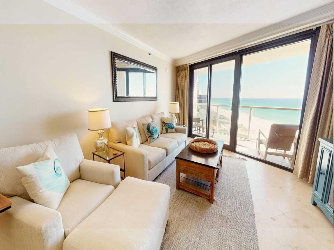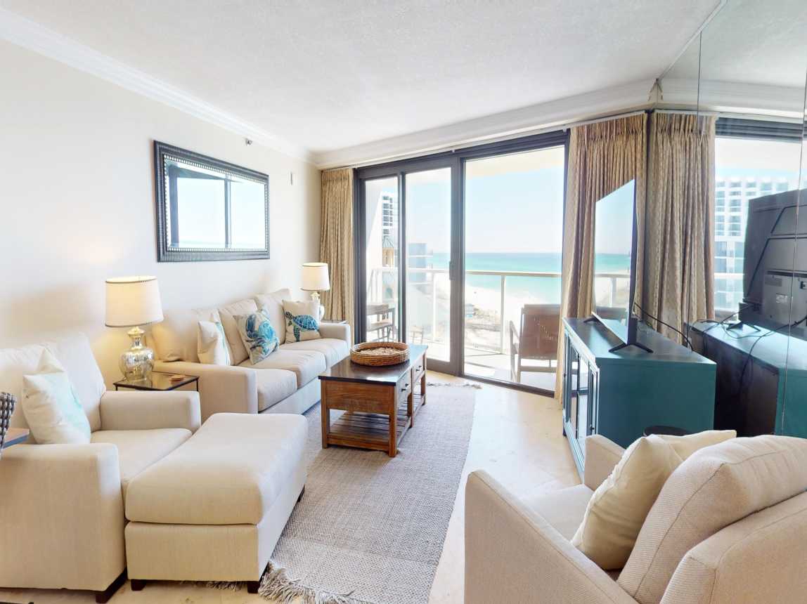 The open floorplan is designed with relaxation in mind. The inviting living area offers a plush sofa, large flat-screen TV, and seamless access to your private balcony—the perfect spot to sip your morning coffee, watch dolphins play, or take in one of the condo’...