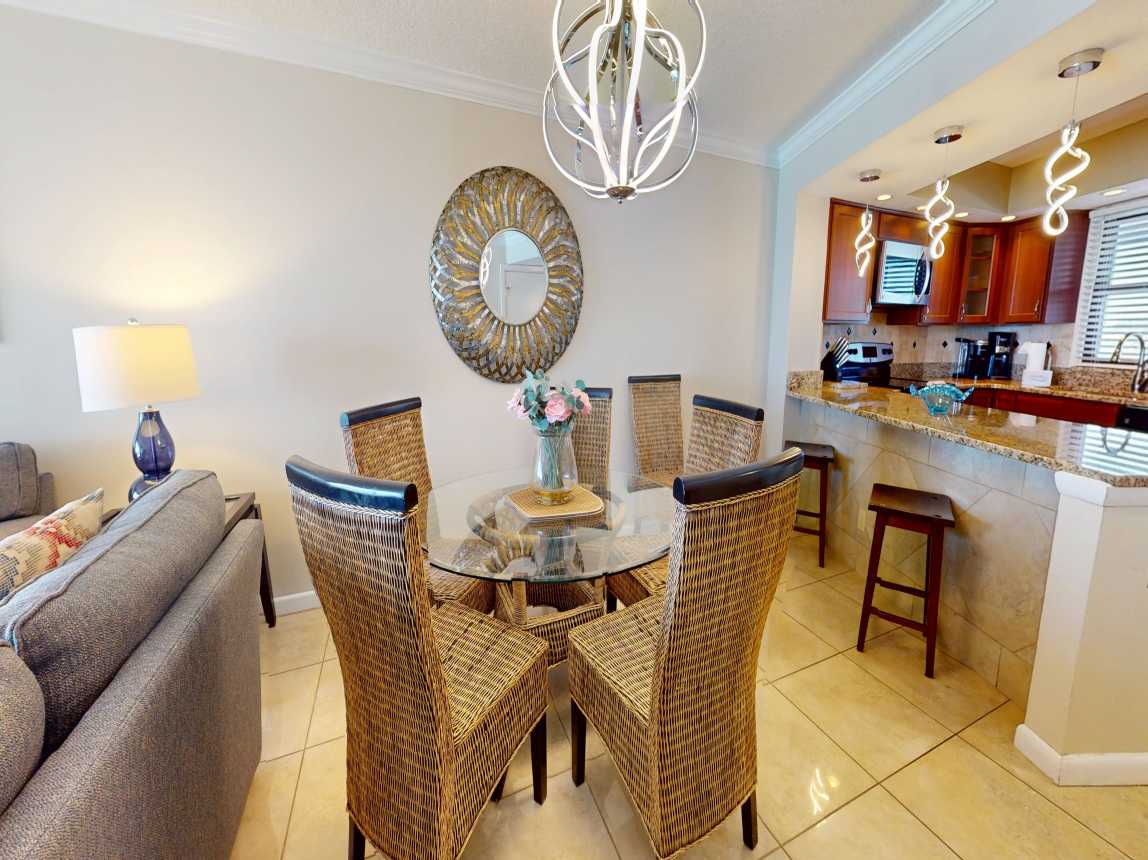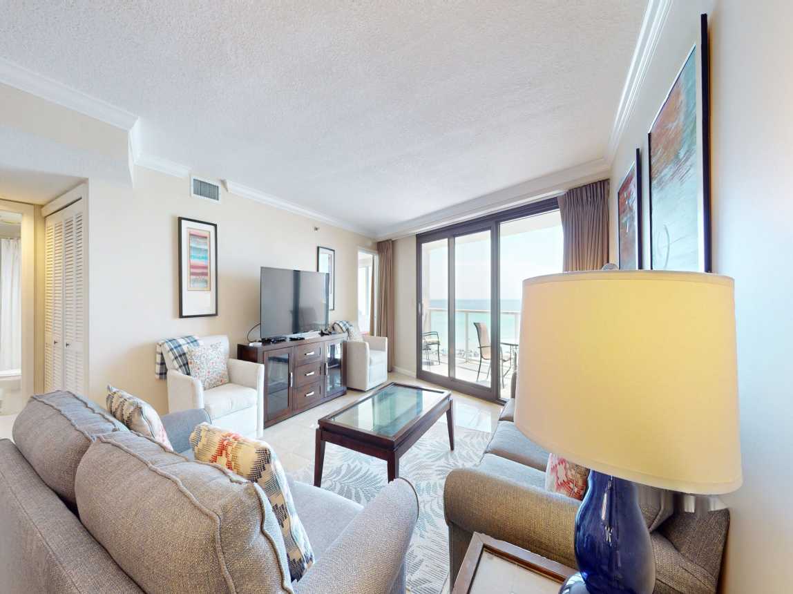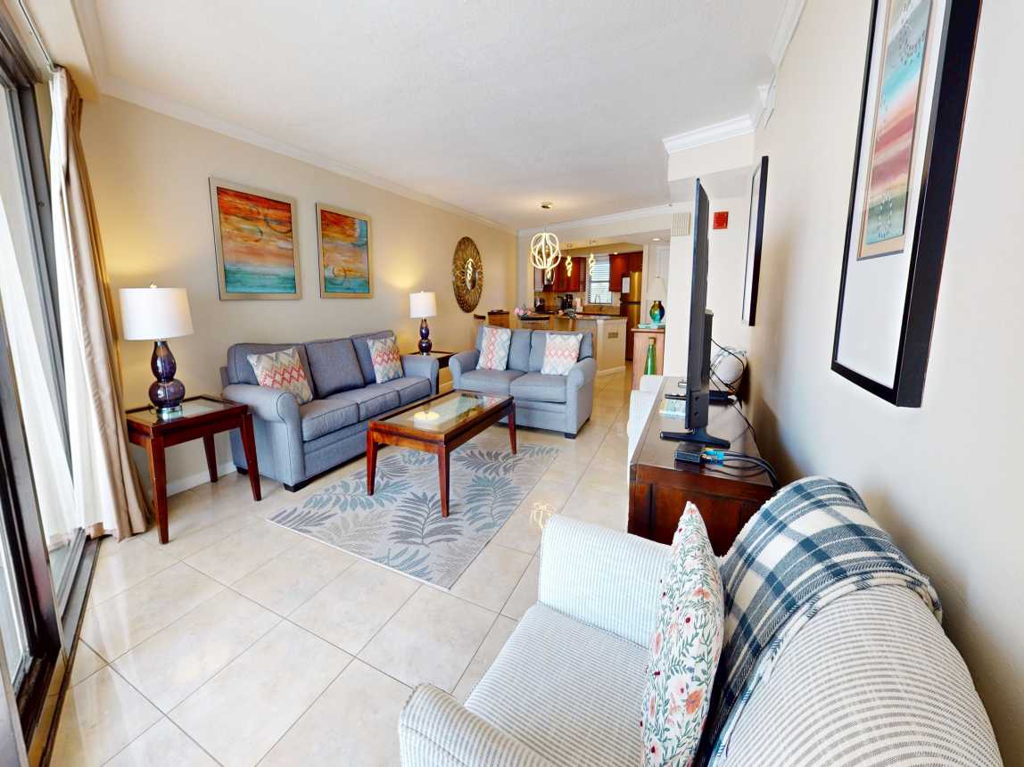 The living room provides plenty of seating for the whole family, complete with a flat-screen TV, DVD player, and sliding doors that open to your private covered balcony. Start your mornings with coffee as you watch dolphins play or en...