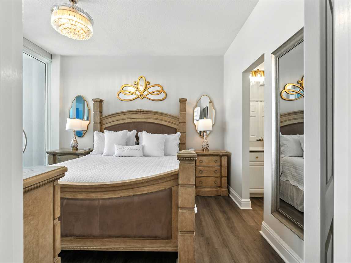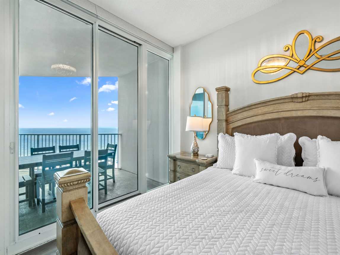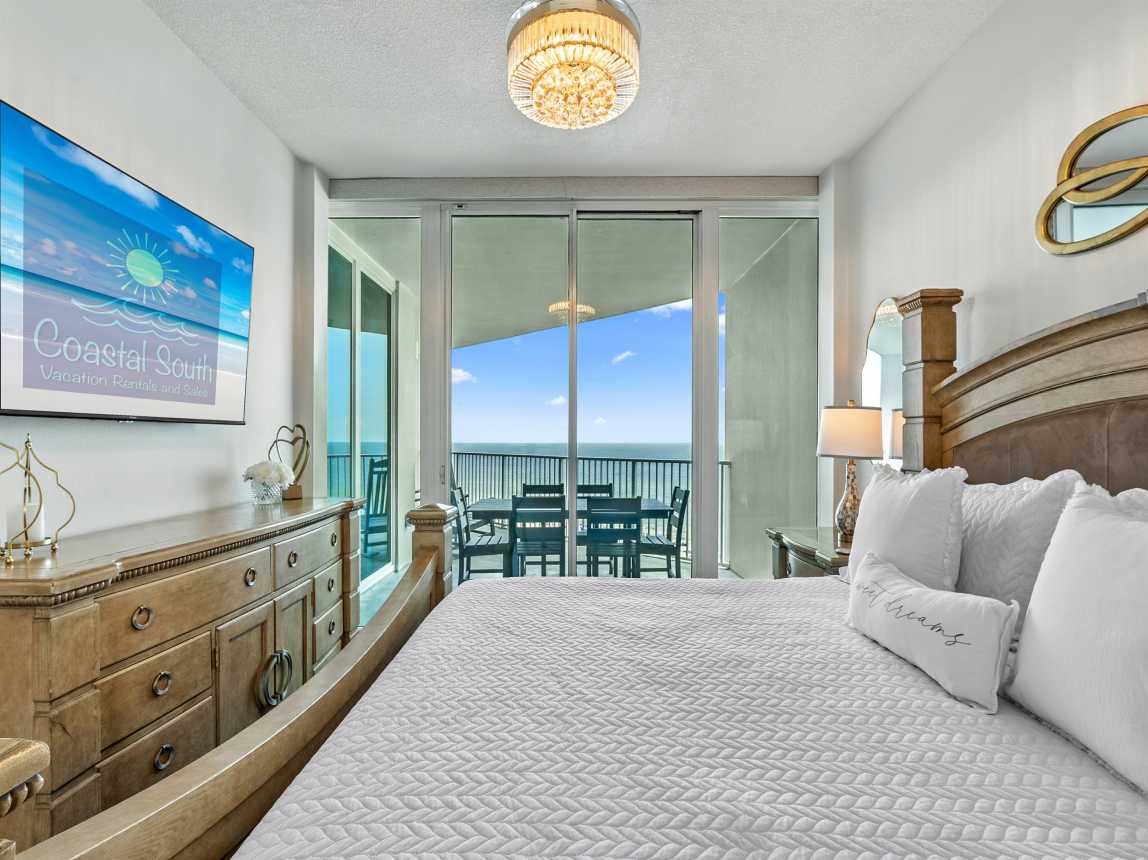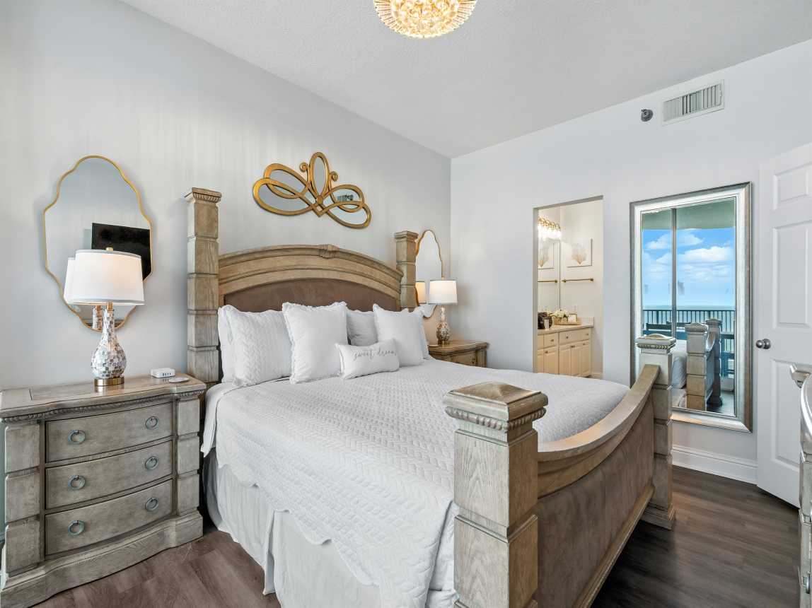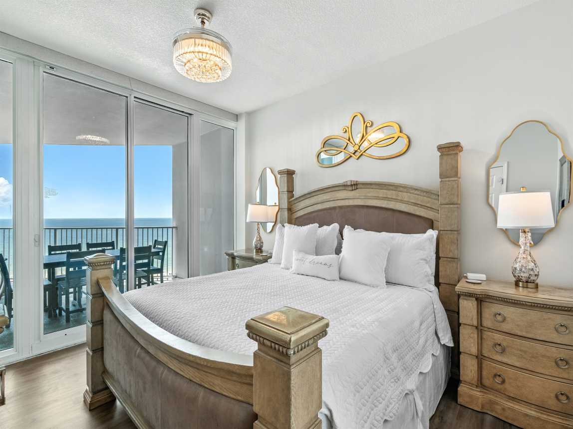 King Master Suite – Gulf views, balcony access, ensuite bath with jetted tub & walk-in shower