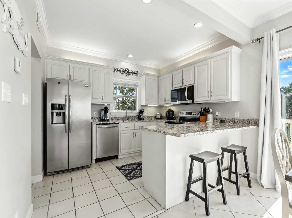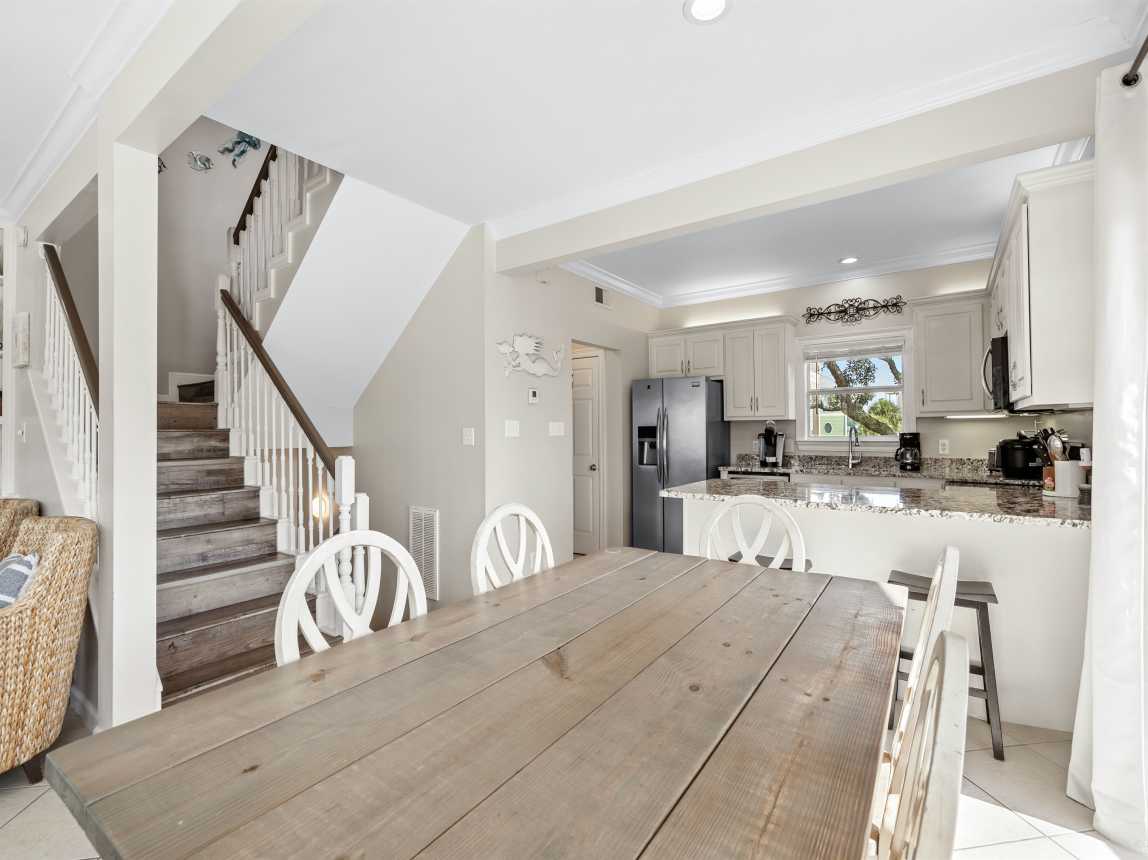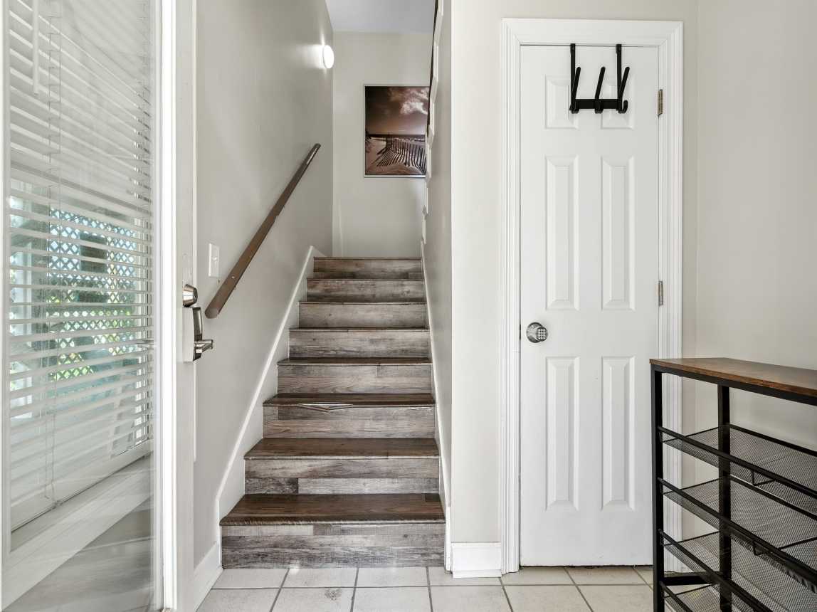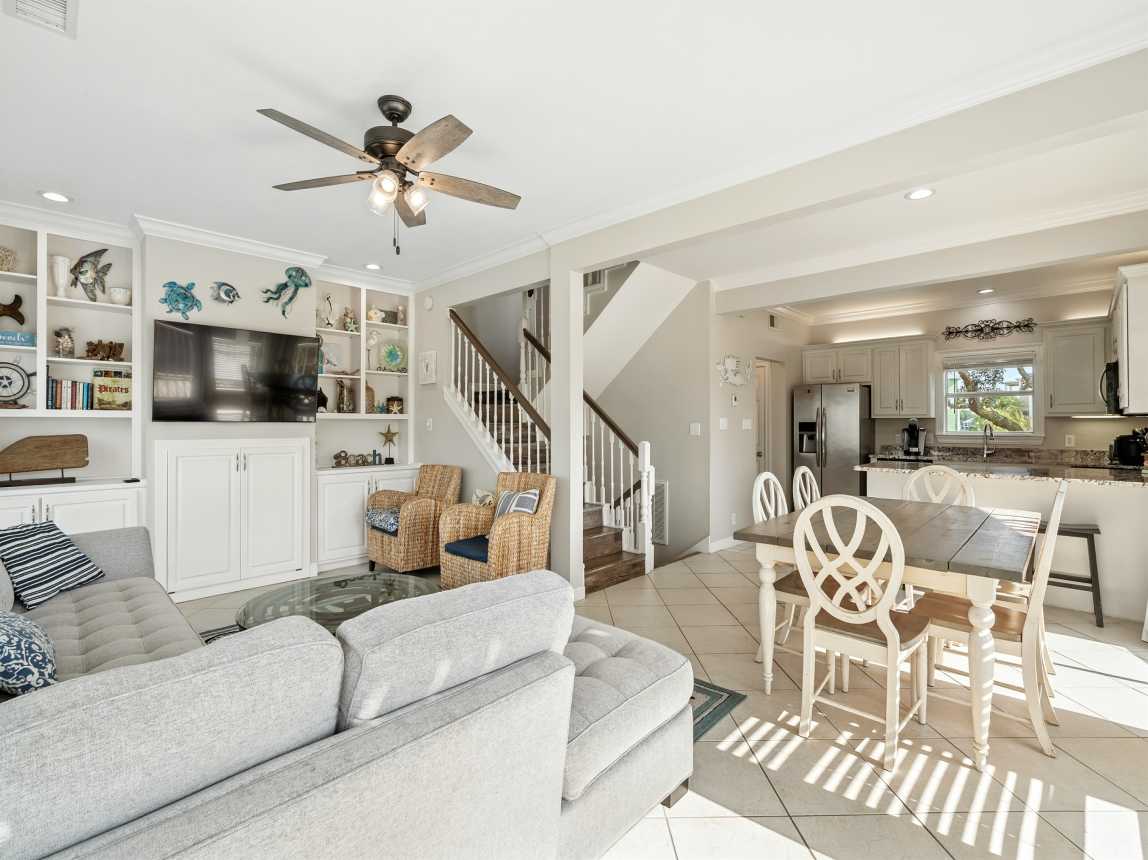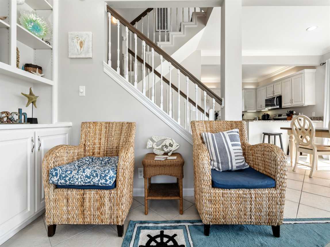 The first floor features an open-concept living room, dining area, and fully stocked kitchen, along with a full bathroom with a walk-in shower. The laundry room is conveniently located on this main living level as well. Step outside onto the balcony with Polywood furniture and enjoy a peaceful spot to unwind.