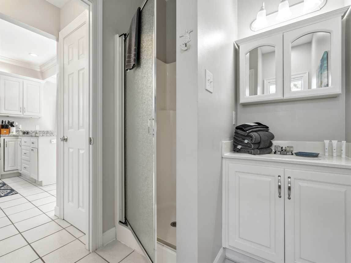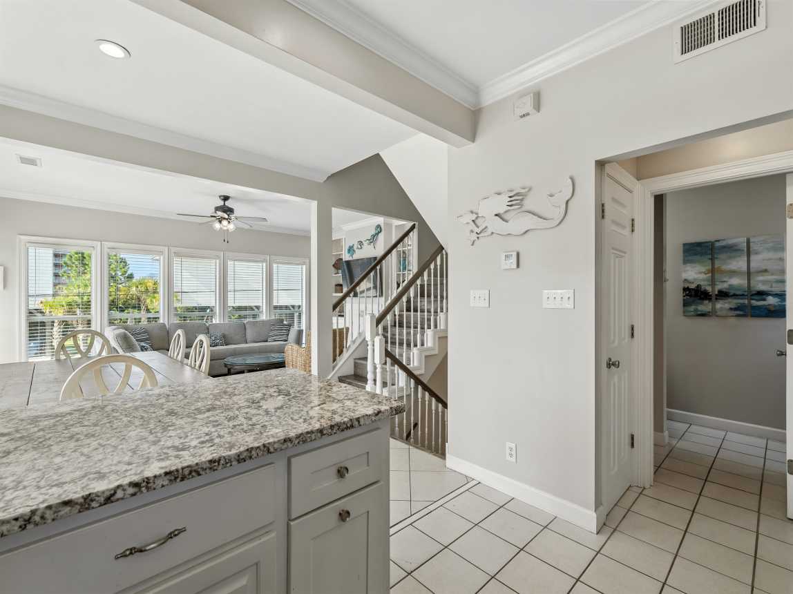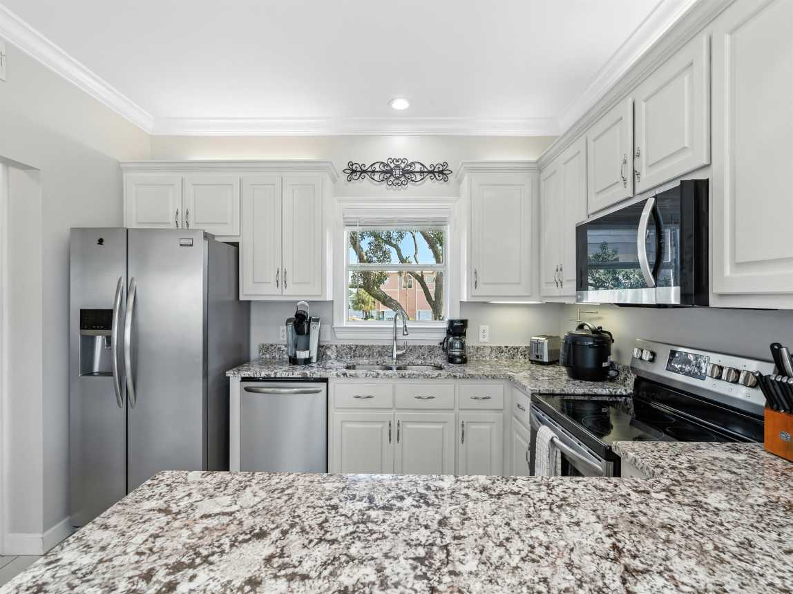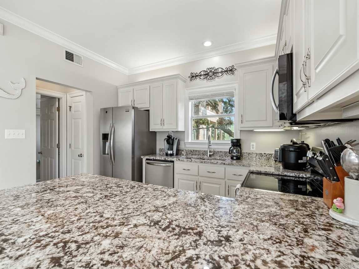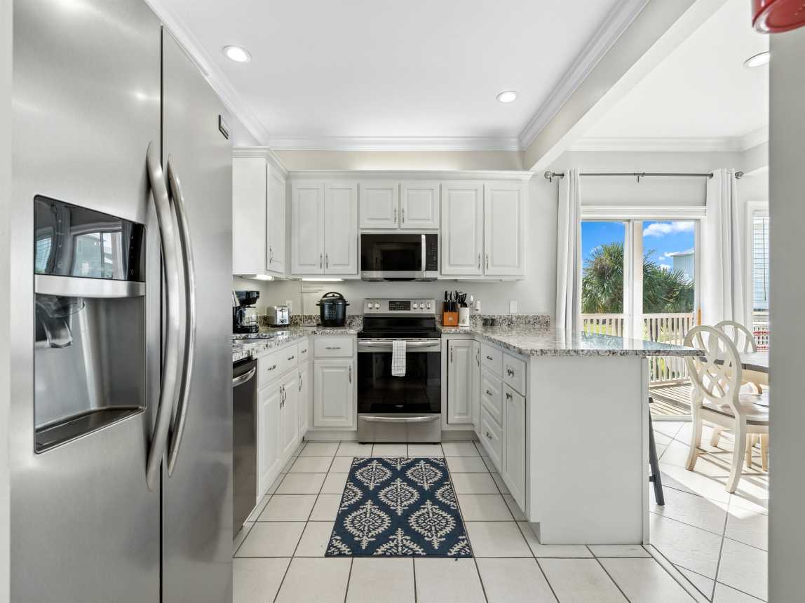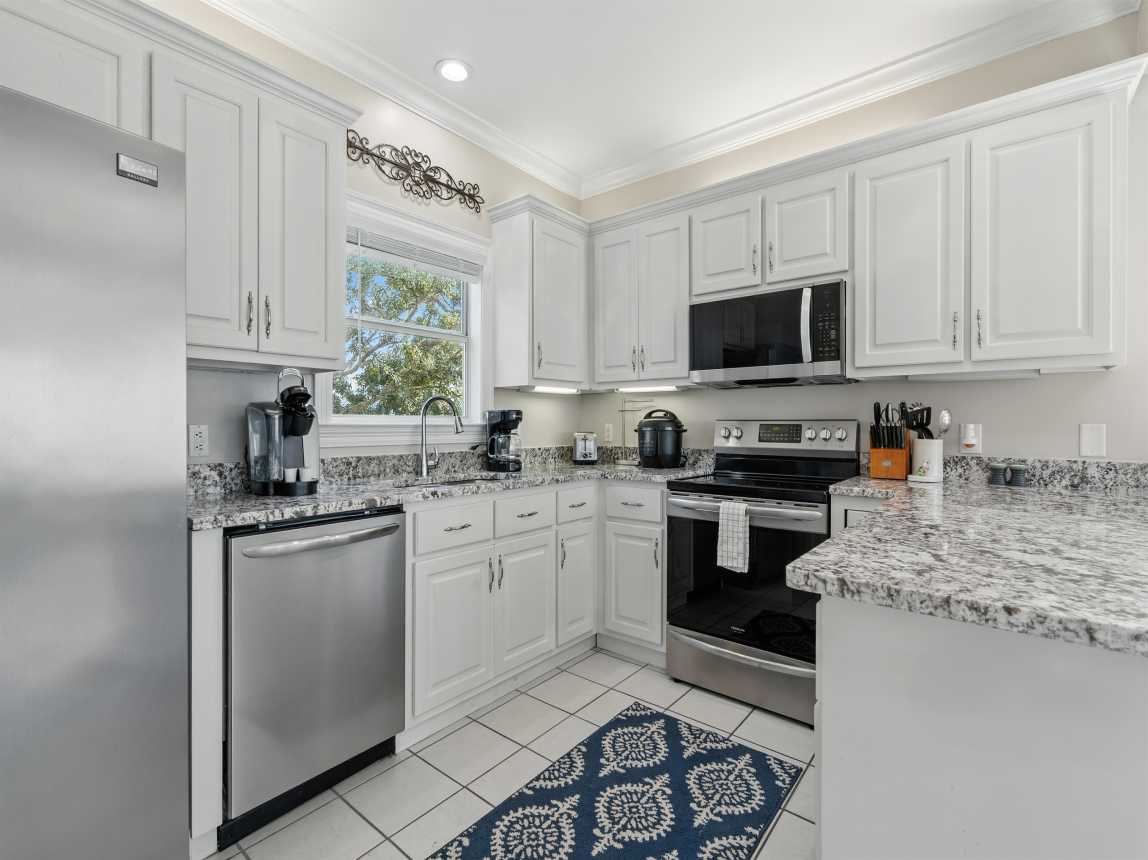 The first floor features an open-concept living room, dining area, and fully stocked kitchen, along with a full bathroom with a walk-in shower. The laundry room is conveniently located on this main living level as well. Step outside onto the balcony with Polywood furniture and enjoy a peaceful spot to unwind.