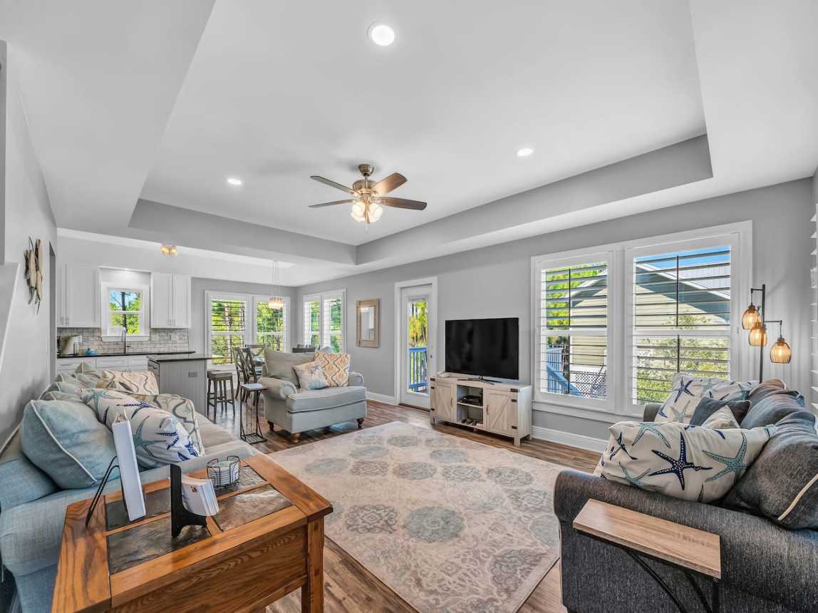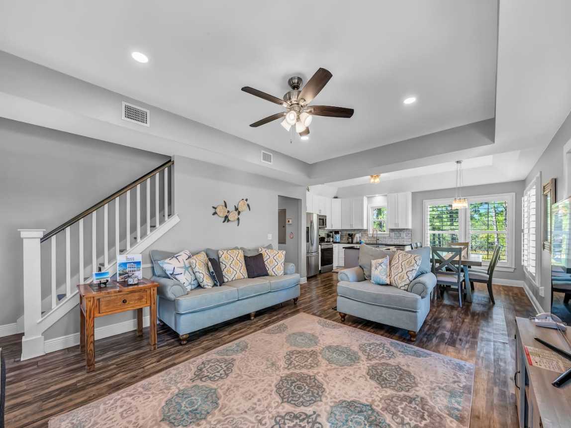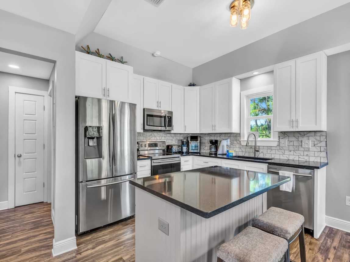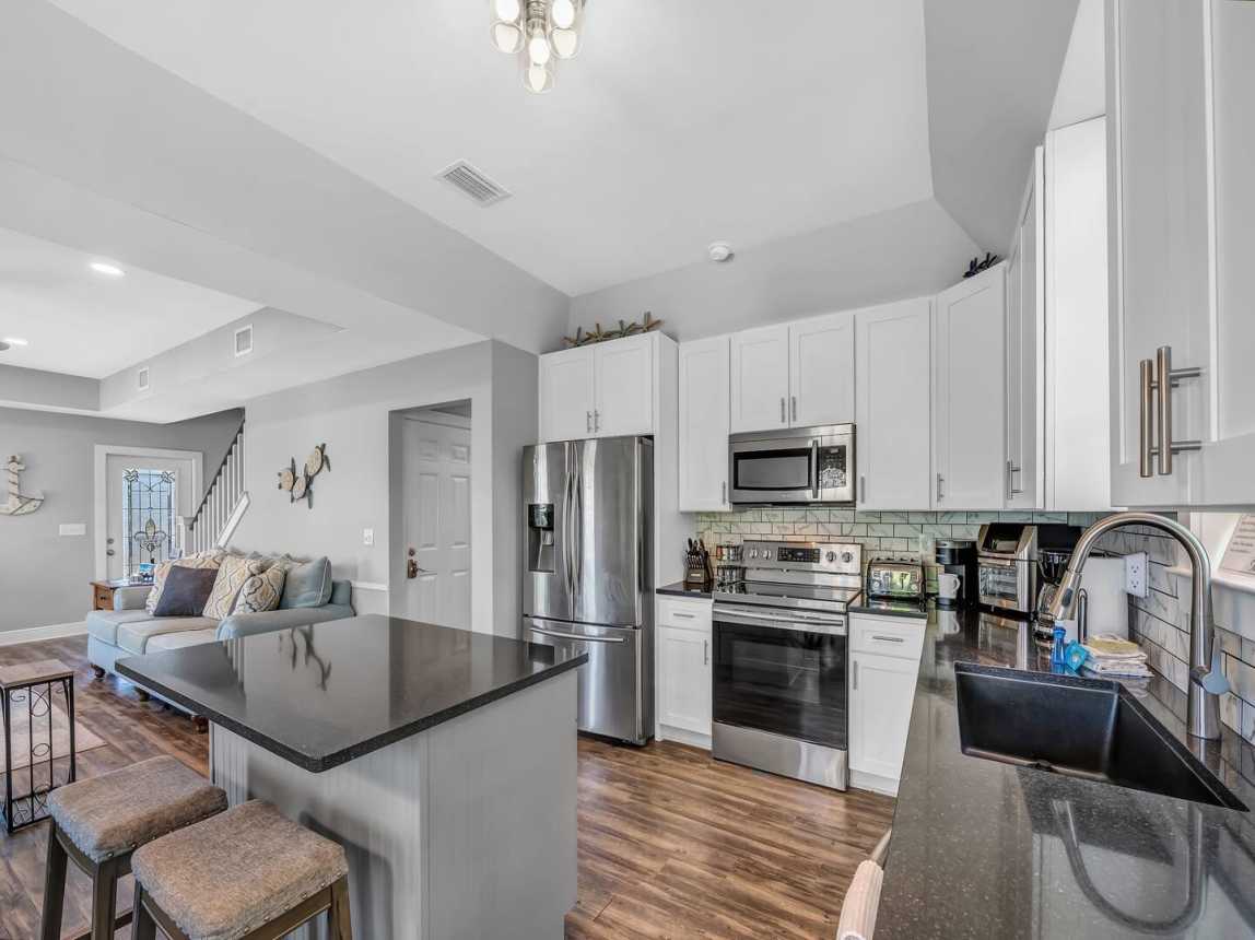 Step into an open-concept living space adorned with updated finishes, custom lighting, and plush seating—ideal for movie nights or post-beach lounging. The fully equipped kitchen with granite countertops and modern appliances makes it easy to whip up everythin...