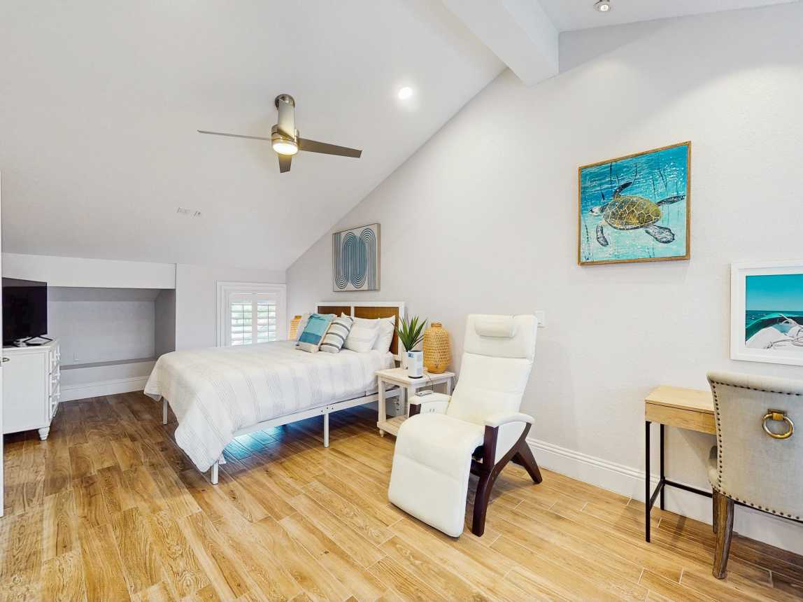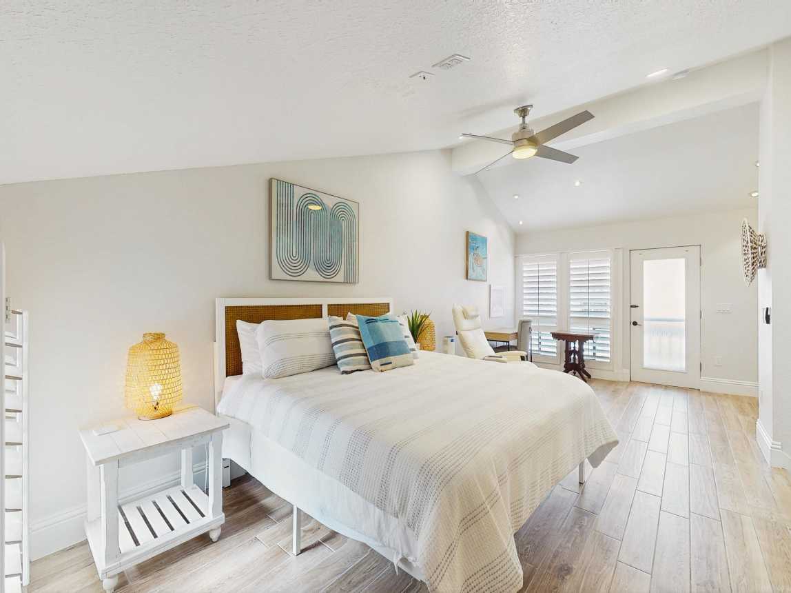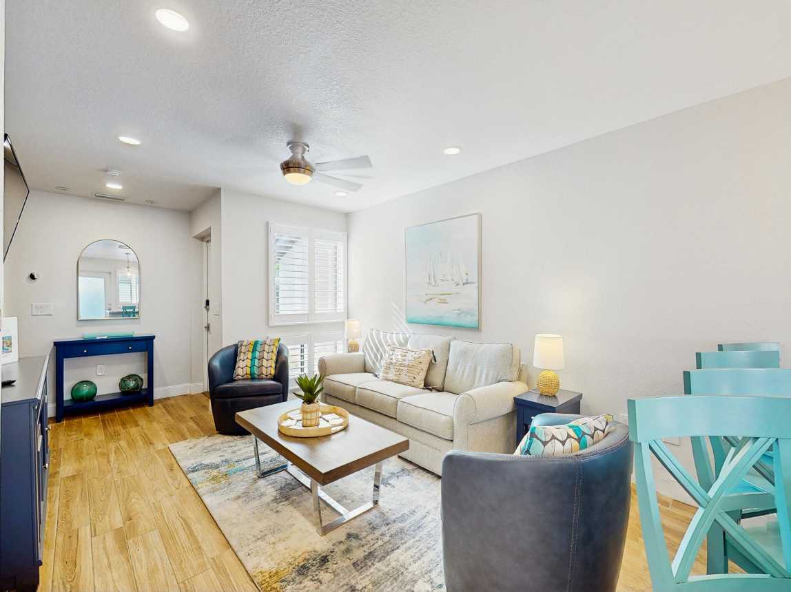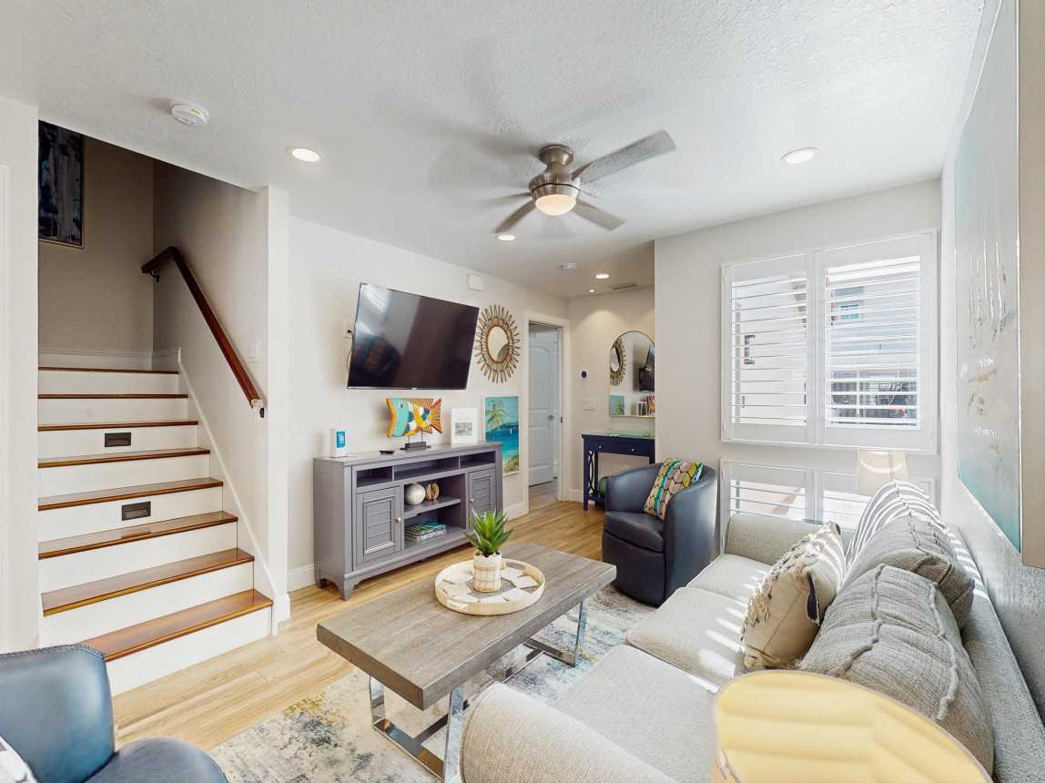 This tasteful coastal home with vaulted ceilings is light, open, and airy. You can relax in the main living space with a sofa and two day chairs. Watch TV after a long day at the beach or set up your laptop/tablet and work remotely at the lovely wooden desk. The ground-level primary bedroom has a large TV and a spectacularly tiled main bathroom with a spacious walk-in shower. A guest bedroom features another TV...