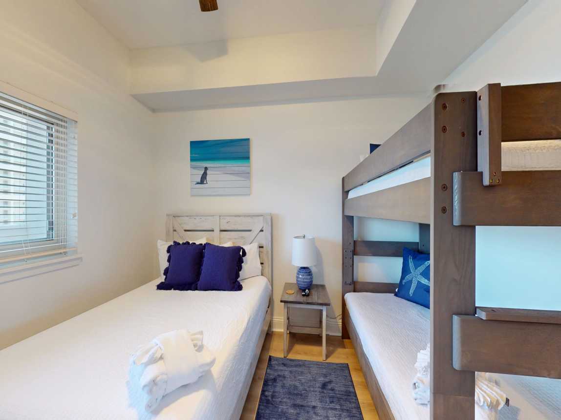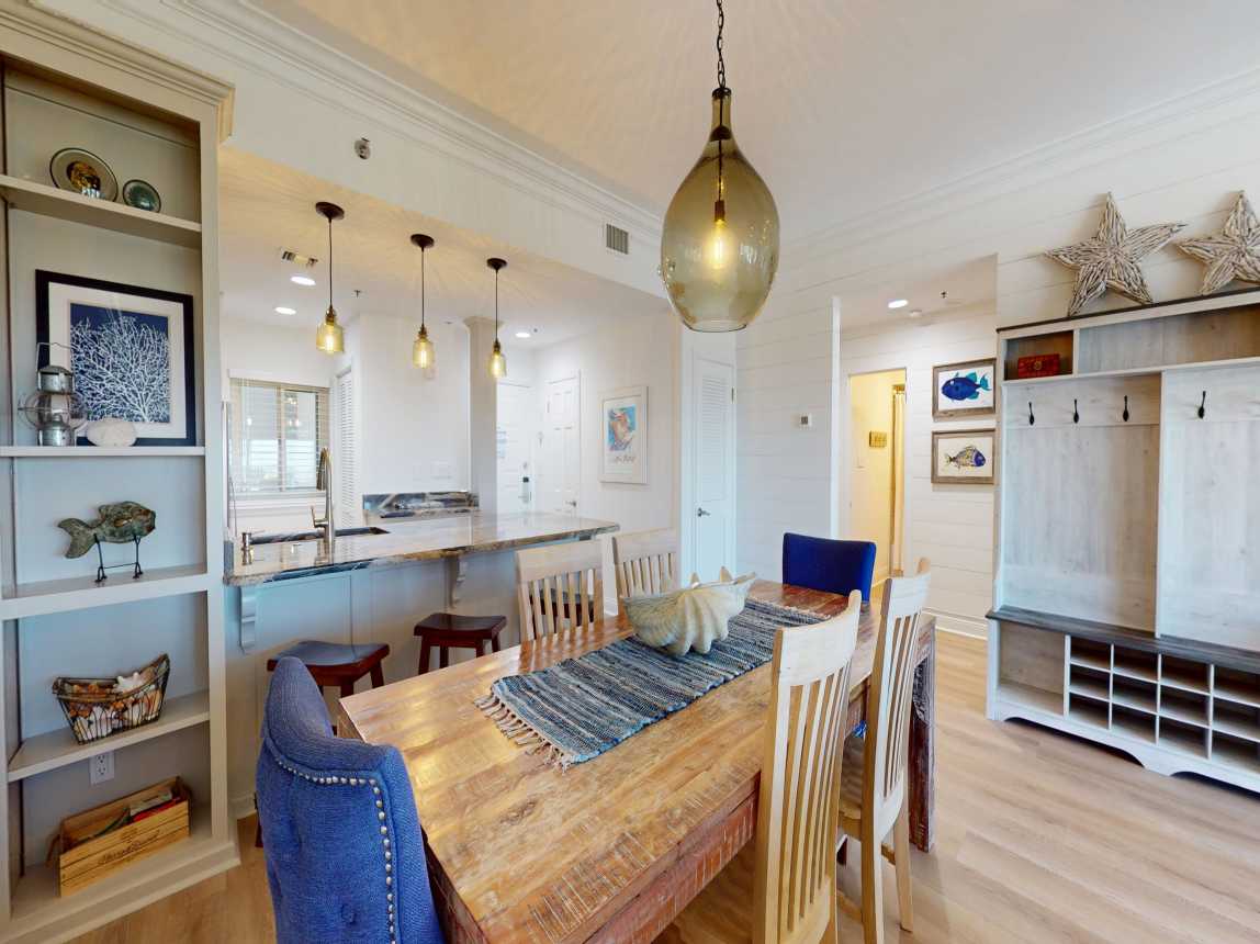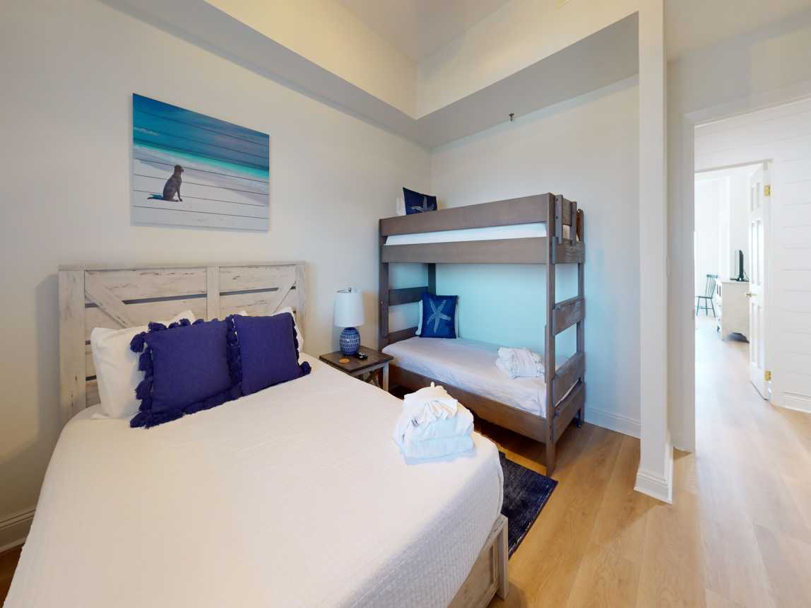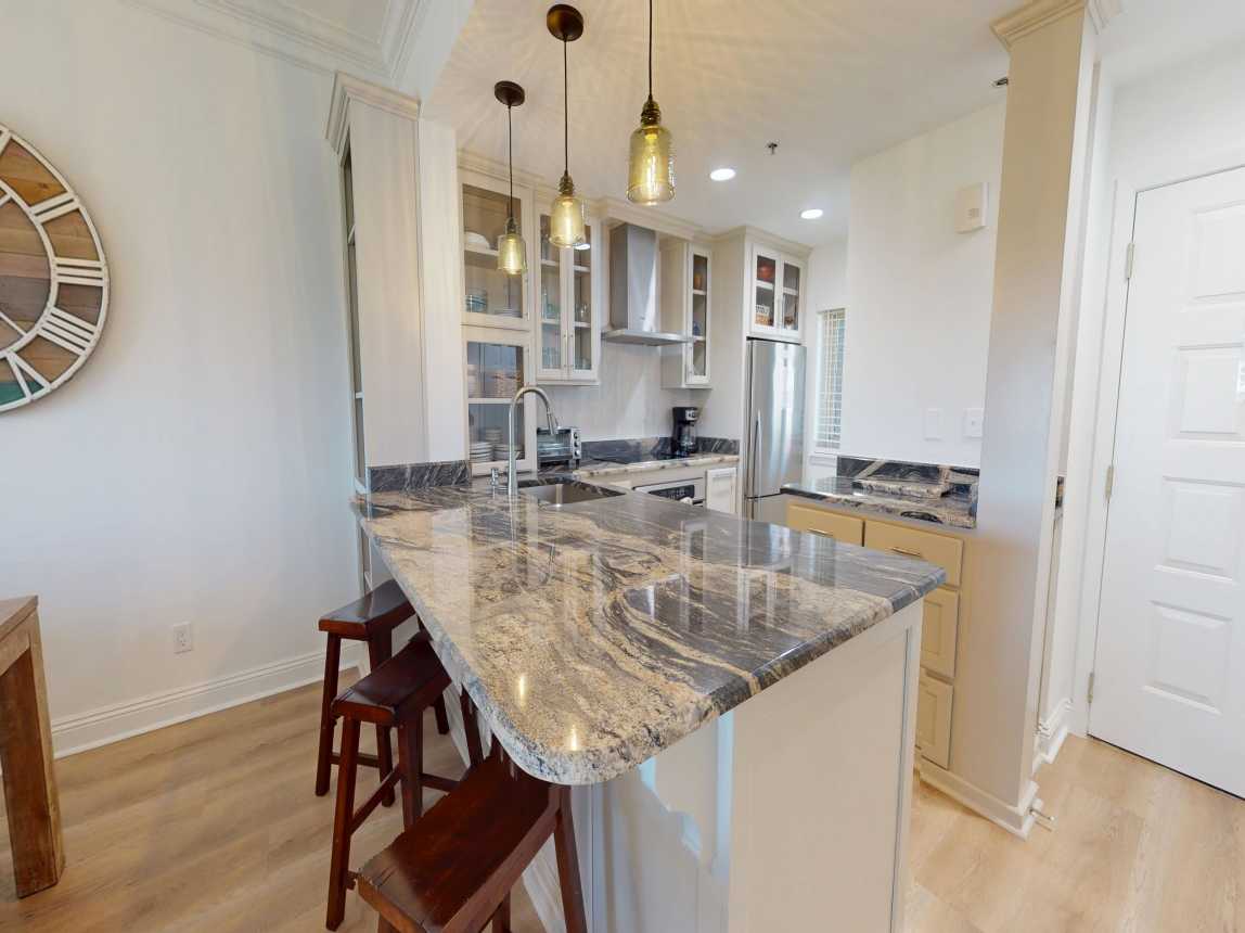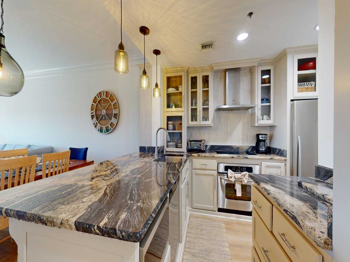The kitchen features granite countertops, stainless steel appliances, and a breakfast bar, while a washer and dryer add extra convenience. Sleeping up to eight, the condo includes a king bed in the master suite, a queen and twin-over-twin bunk in the guest room, plus a queen sleeper sofa in the living room. The master bath offers a walk-in shower and double vanity, while the guest bath has a shower/tub combo.