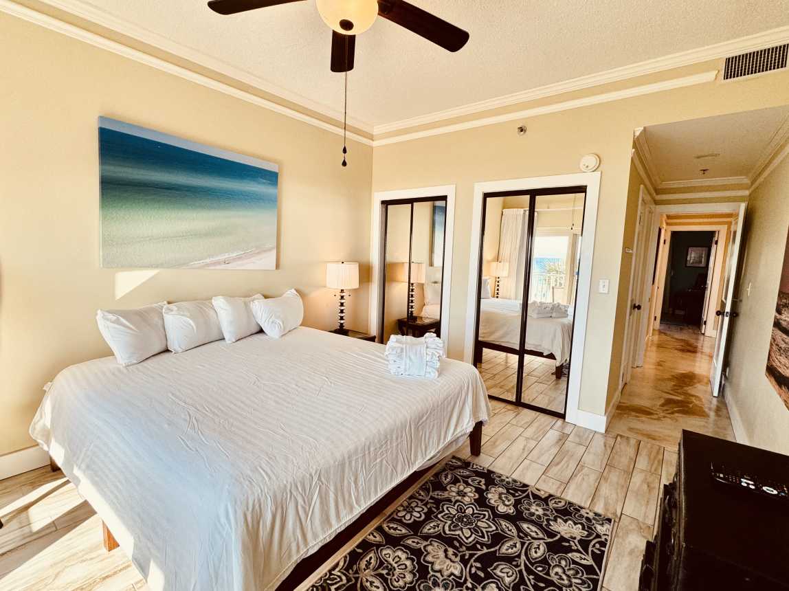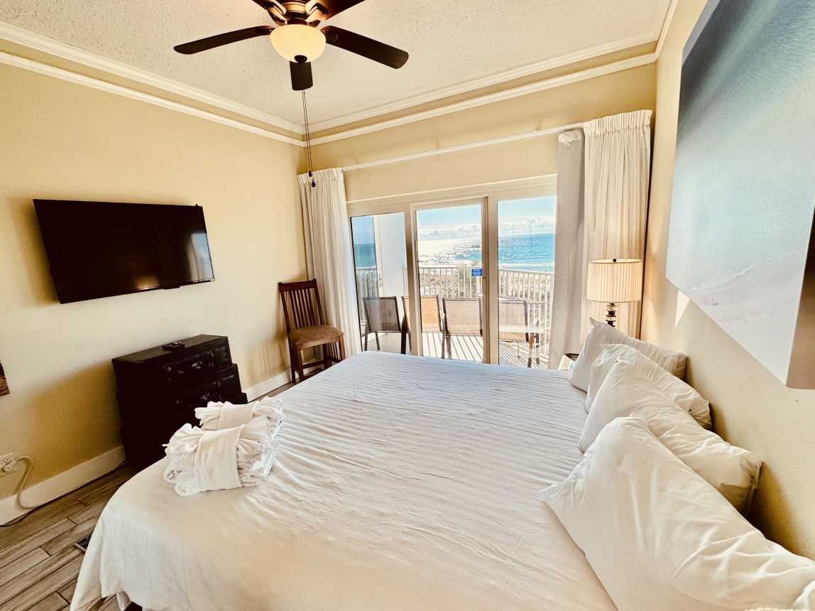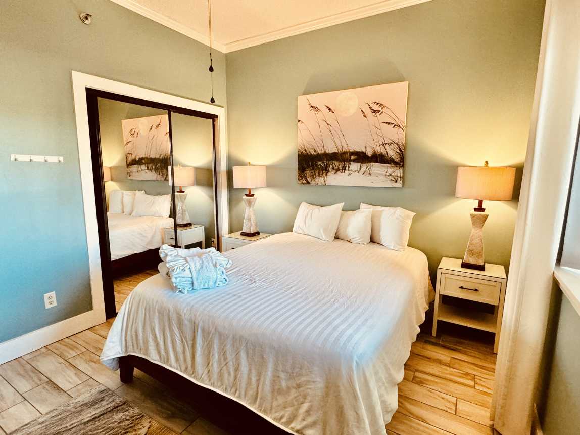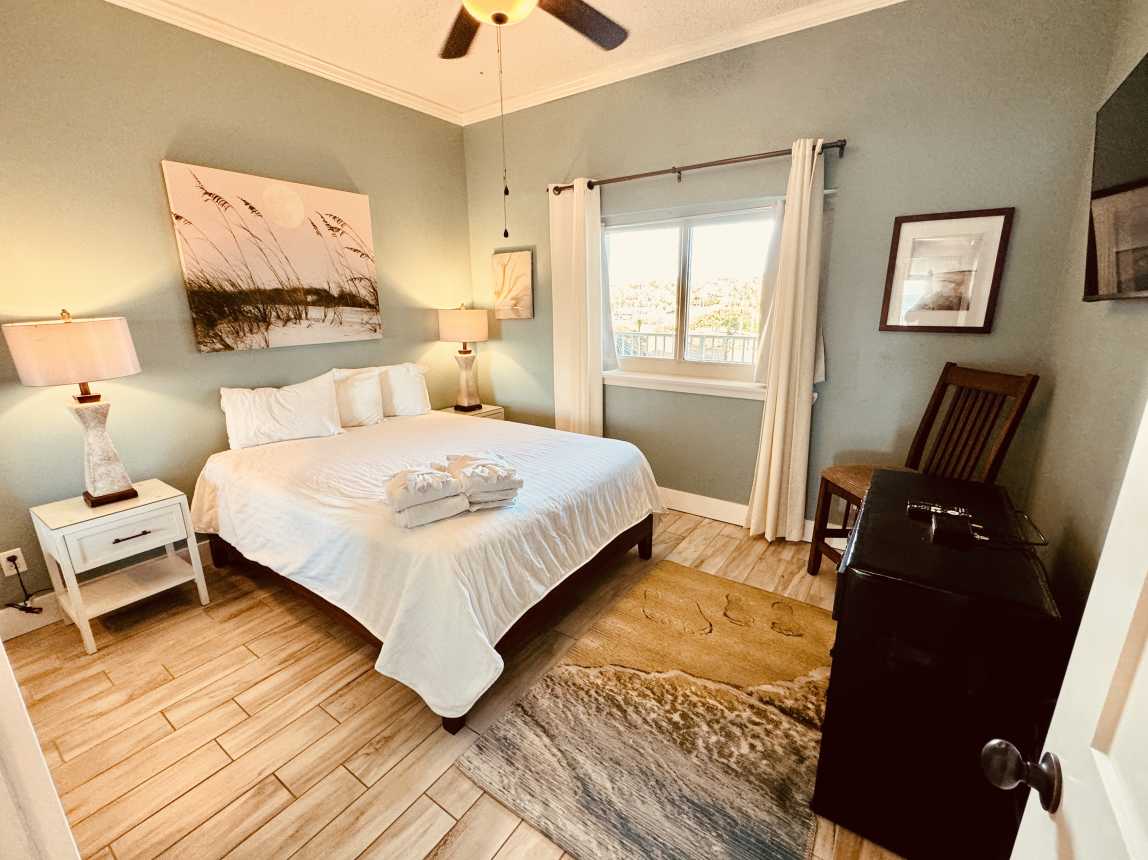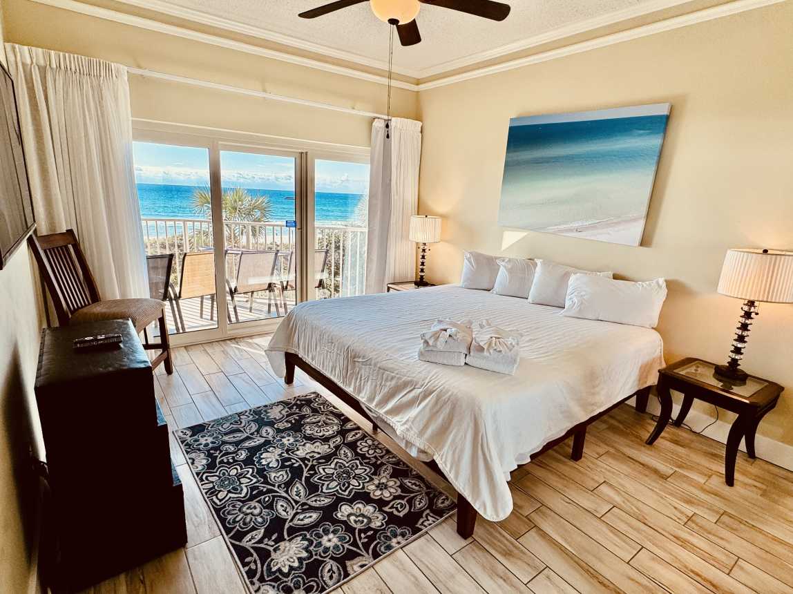 The master suite offers a private Gulf-view balcony, a brand-new king mattress, and an en-suite bath with a spacious double vanity. The guest bedroom includes a n...