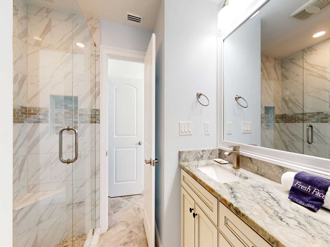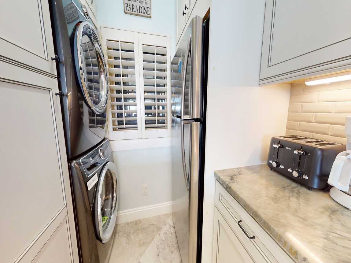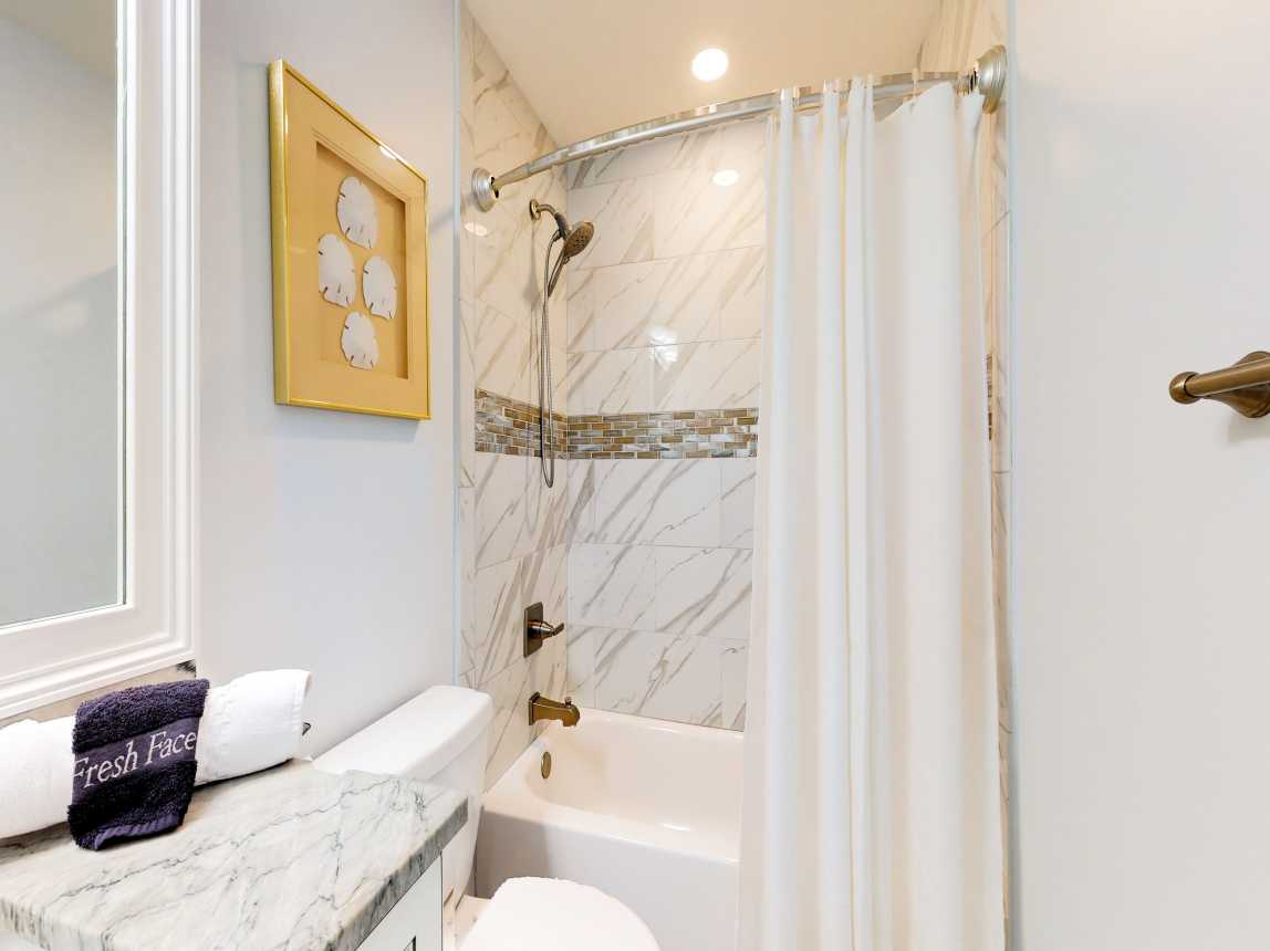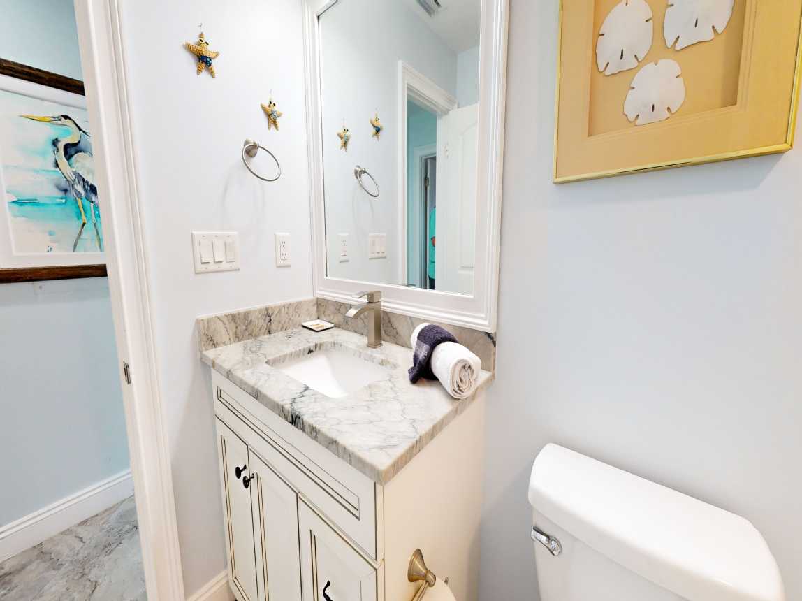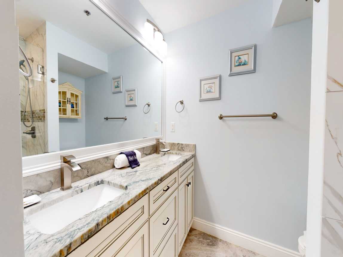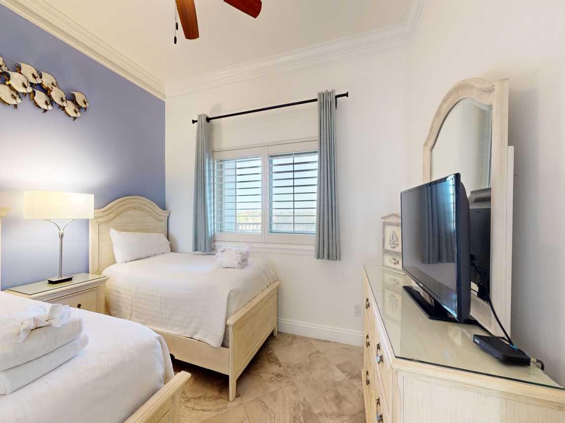 The master suite features a king bed, closet space, TV, and private en-suite with a dual vanity and spacious walk-in shower. Down the hall, the guest bedroom includes two twin beds, a TV, and closet space, with the guest bathroom offering a single vanity and tub/shower combo. New furnishings, beautiful tile throughout, and extensive kitchen and bath renovations ensure a comfortable, stylish stay. Step onto your private beachfront ...