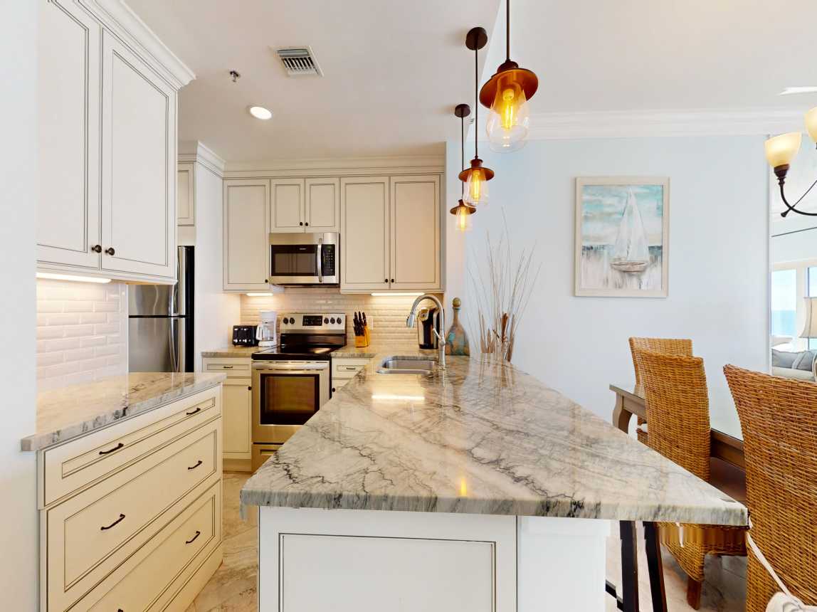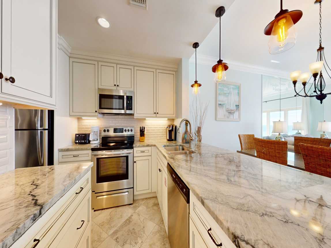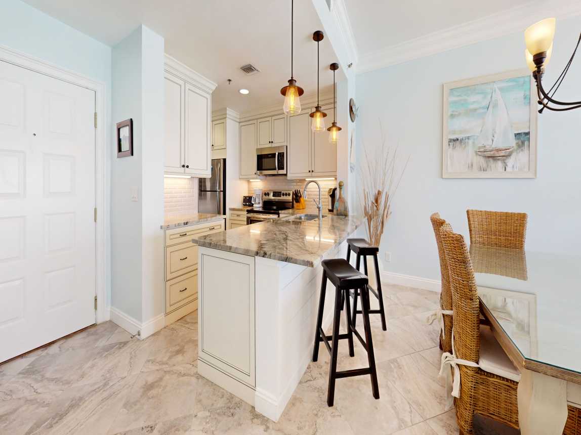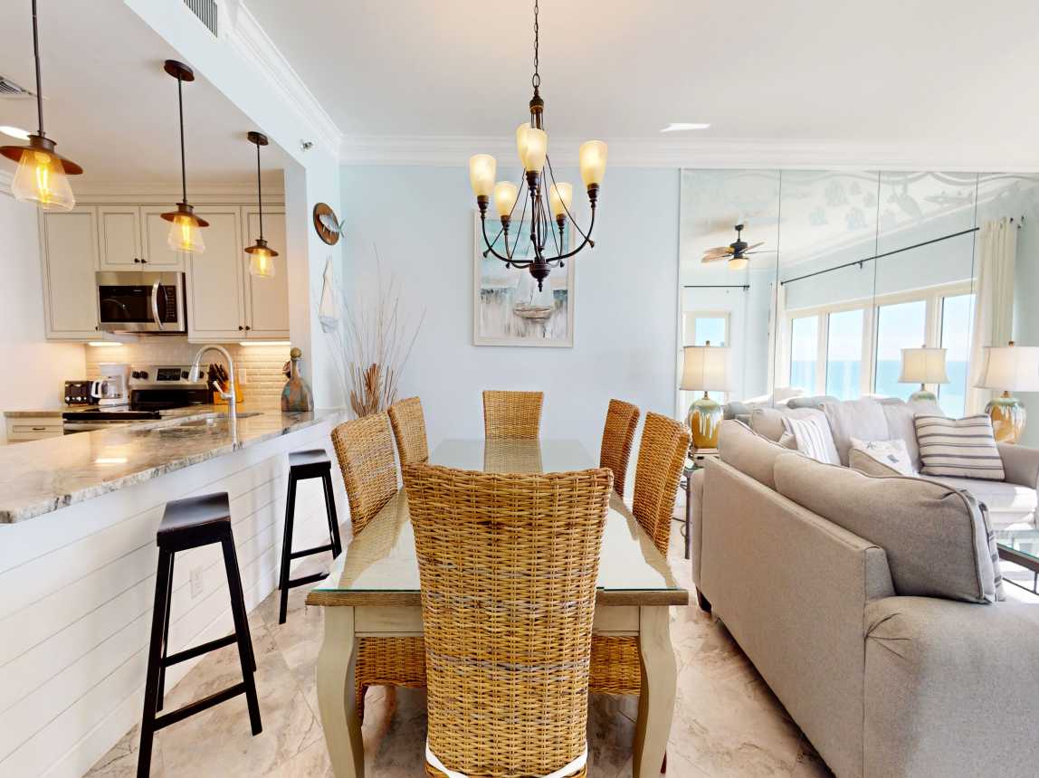 The moment you step into Beach Manor 709, your beach vacation begins. A fully remodeled, well-stocked kitchen and a stunning dining table with panoramic Gulf views greet you upon entry. The cozy living room offers ample seating, a large flat-screen TV, a sofa sleeper, and mesmerizing views of the shoreline.