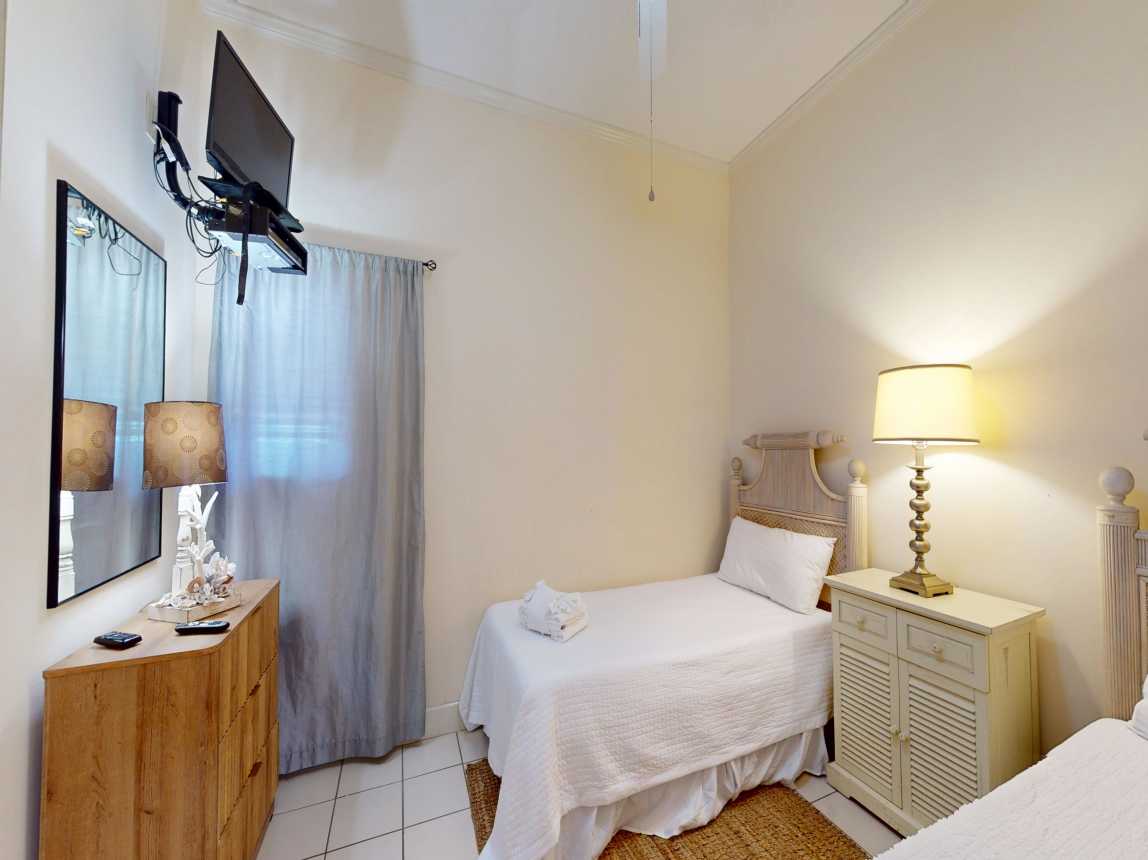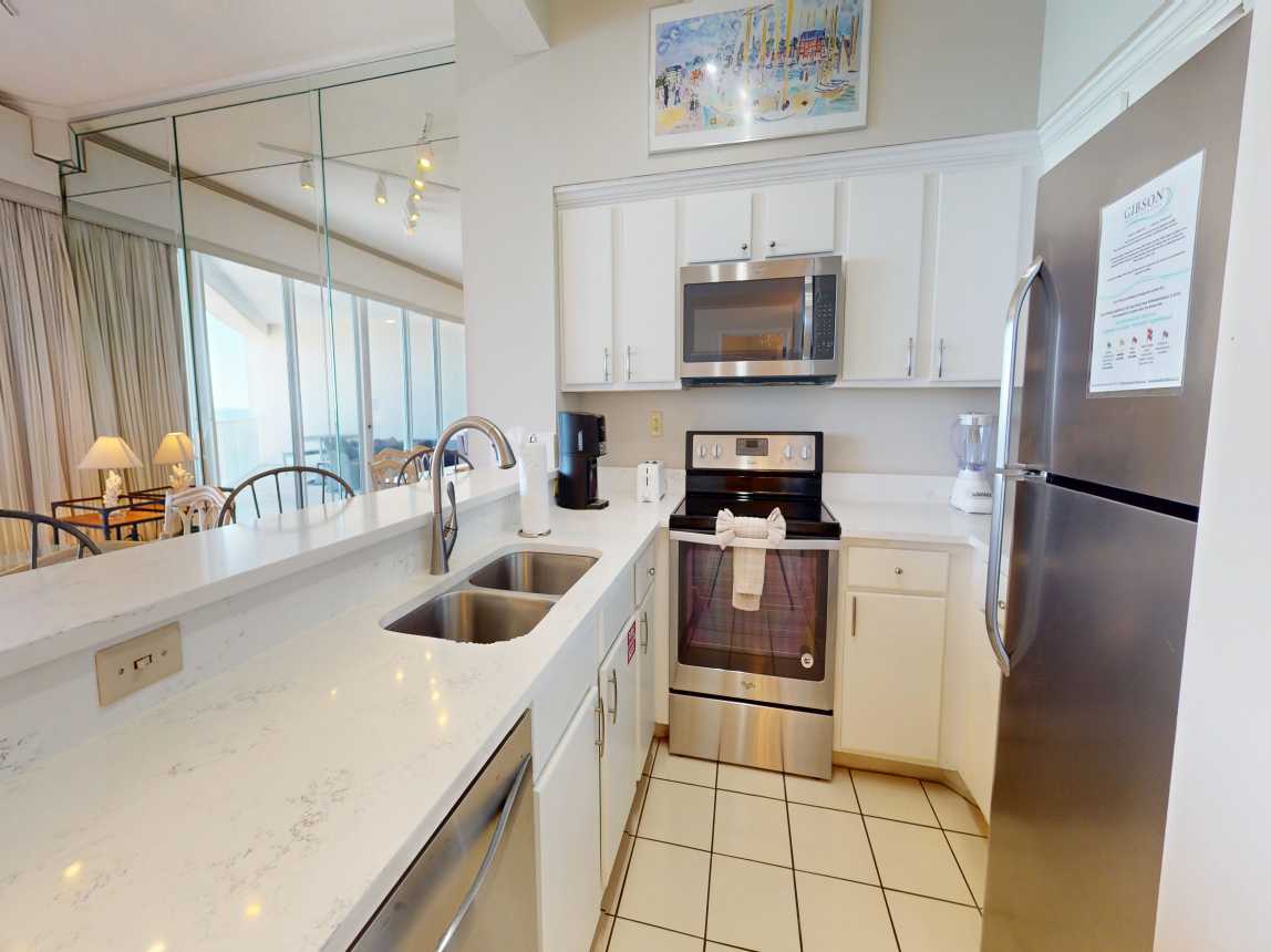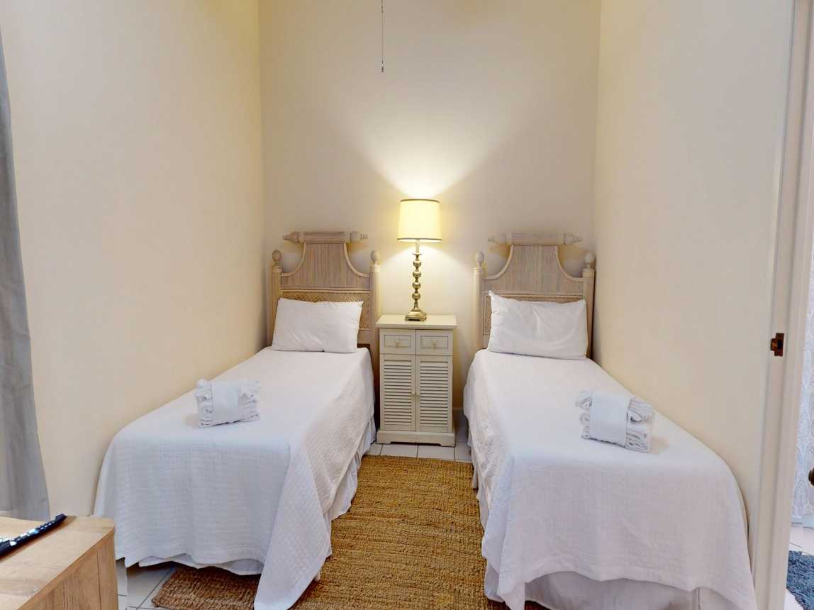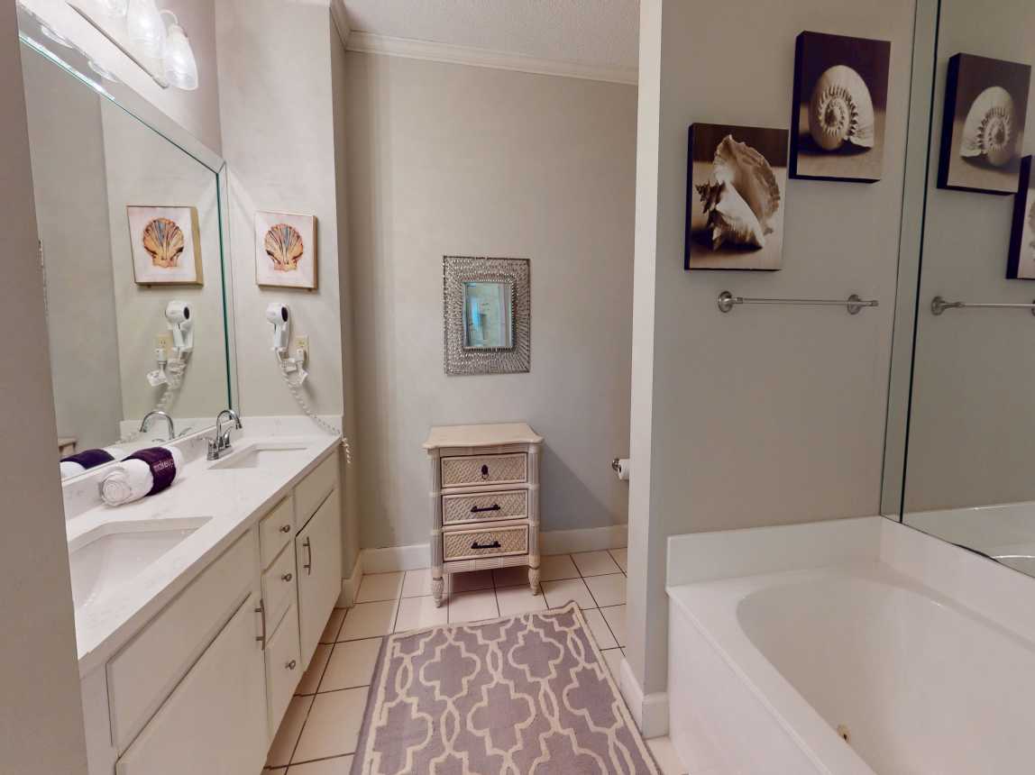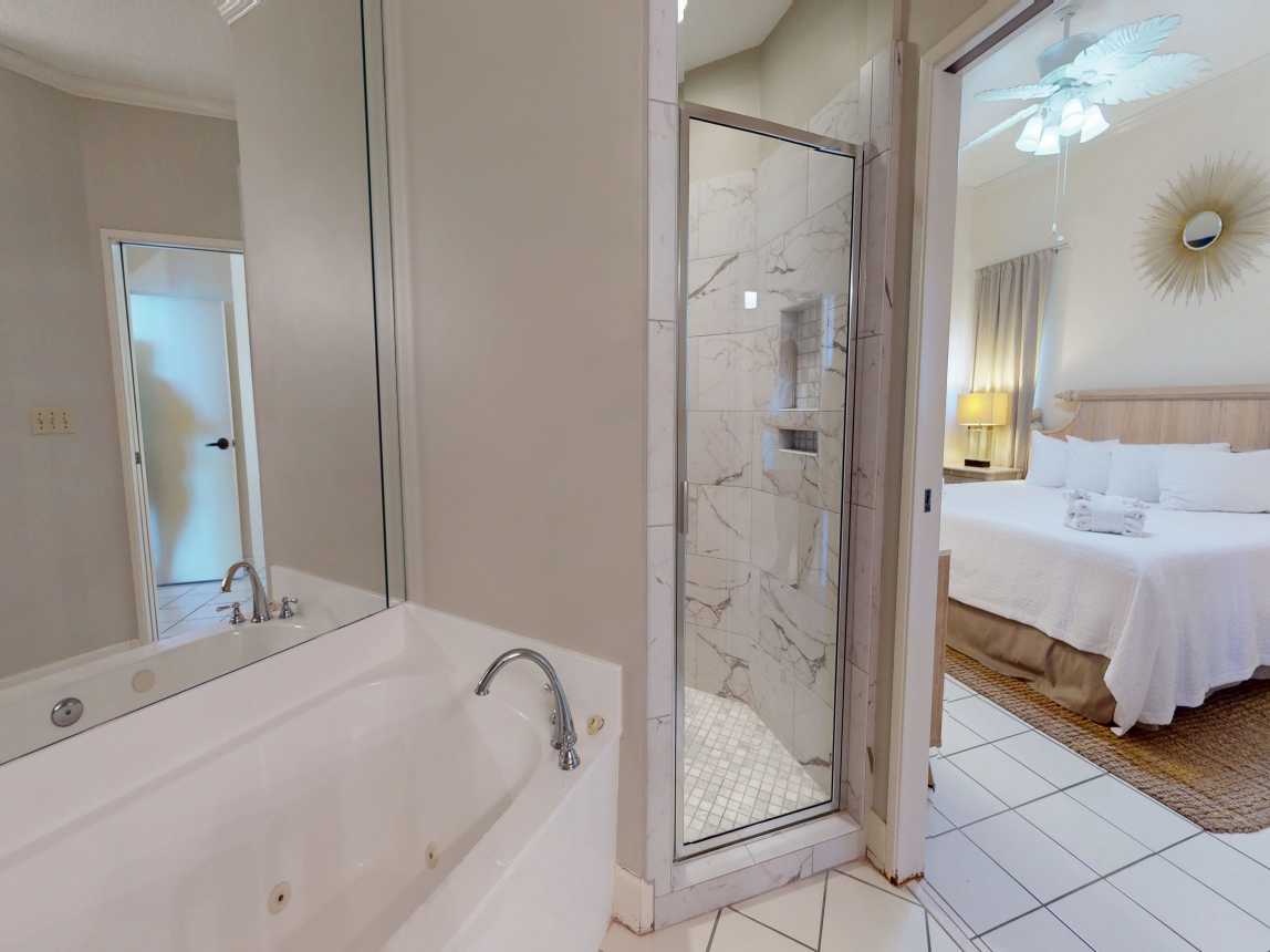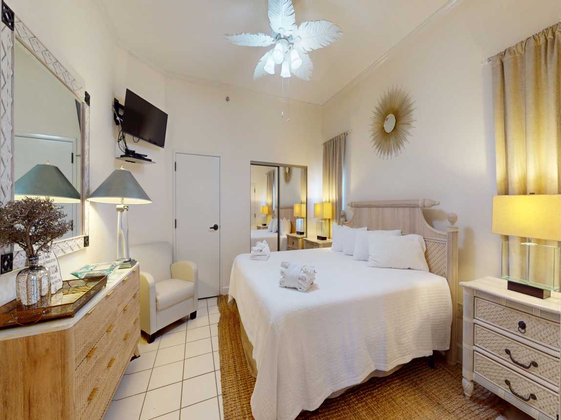 This beautifully appointed condo comfortably sleeps up to 6 guests, making it perfect for families or friends. The master suite features a king bed and a private en-suite bathroom with a walk-in shower and garden tub for a spa-like experience. The guest room offers two twin beds, while the hallway guest bathroom includes a shower/tub combo. A sleeper sofa in the living room provides additional accommodations.